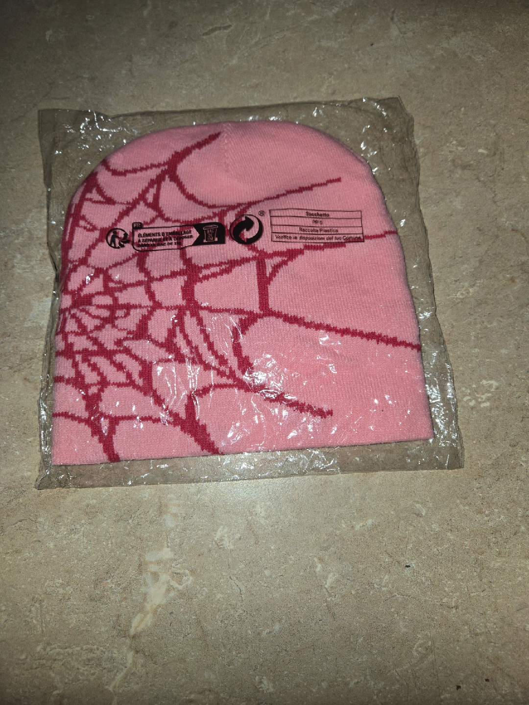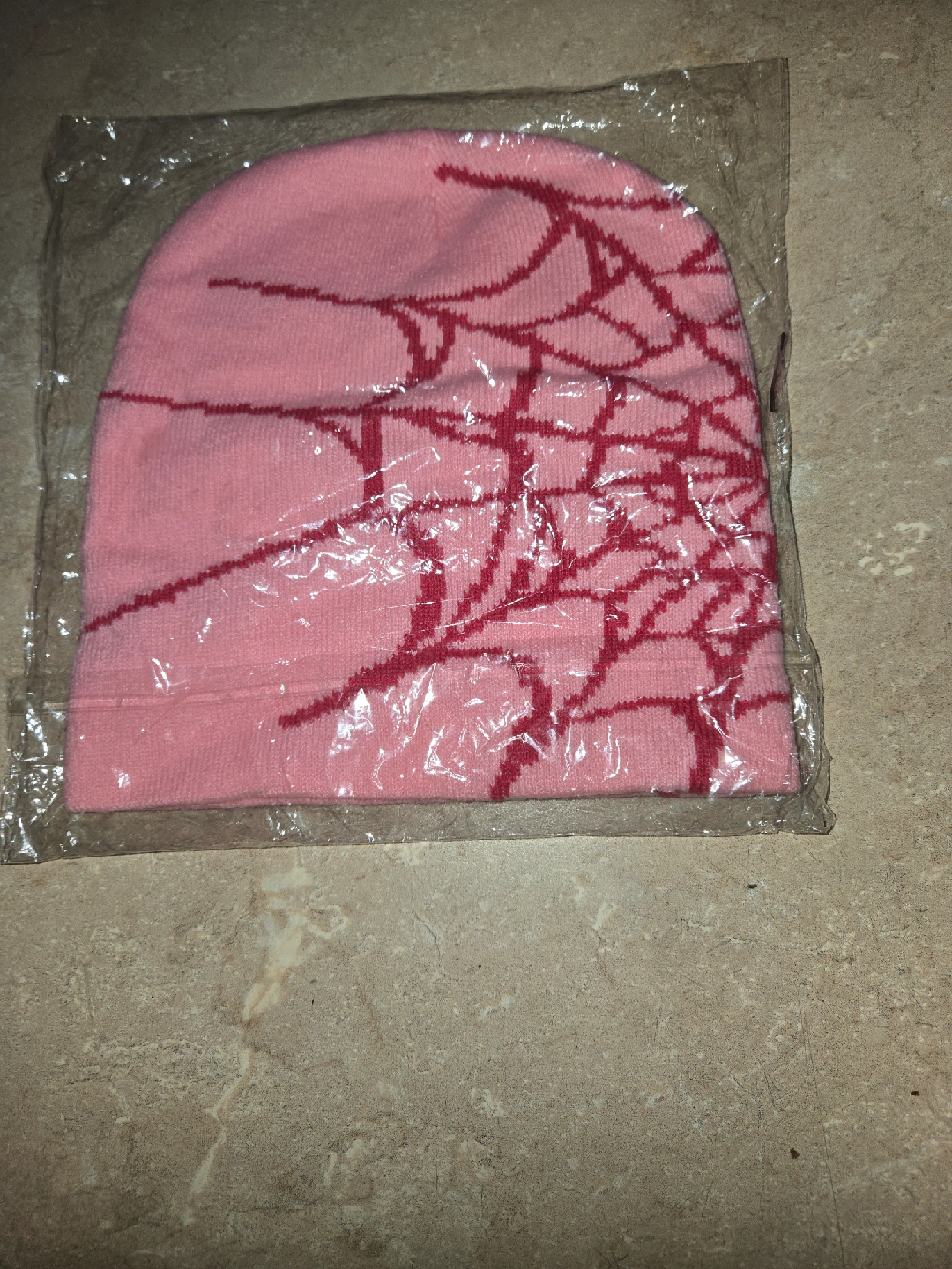 159Brand new pink beanie still in its original packaging! It has a cool red spiderweb design on it. Perfect for keeping your head warm and adding a bit of style to your outfit