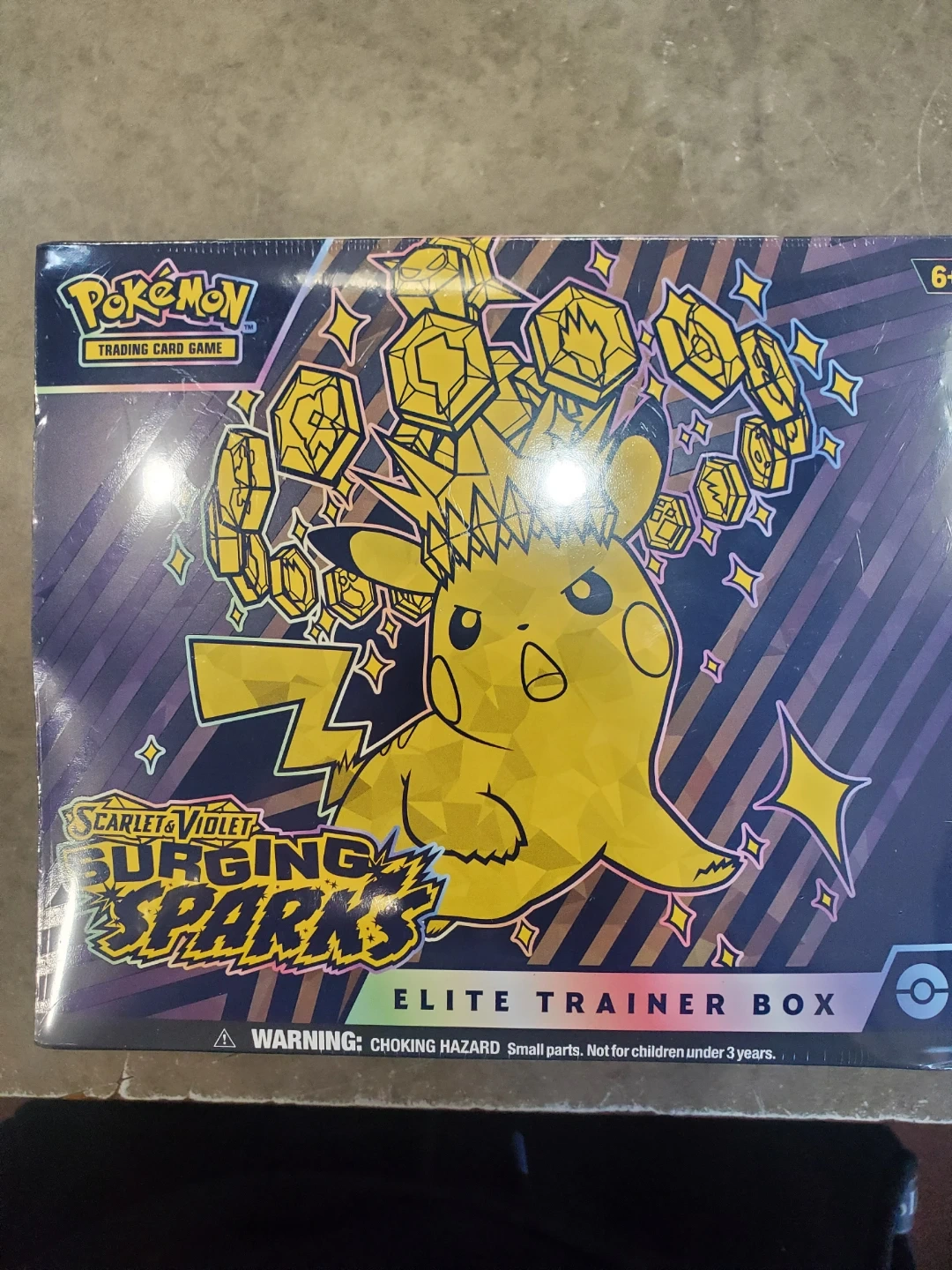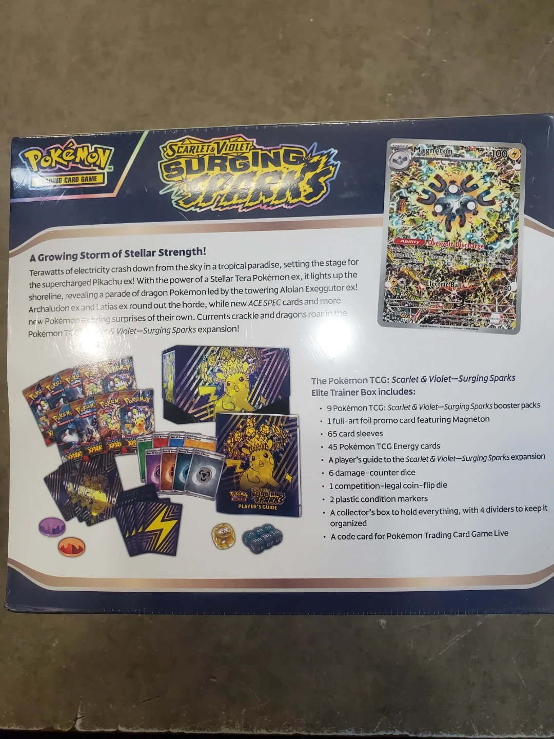 10Selling a brand new, sealed Pokémon Scarlet & Violet - Surging Sparks Elite Trainer Box! It includes: - 9 Pokémon TCG: Scarlet & Violet-Surging Sparks booster packs - 1 full-art foil promo card featuring Magneton - 65 card sleeves - 45 Pokémon TCG Energy cards - A player's guide to the Scarlet & Violet-Surging Sparks expansion - 6 damage-counter dice - 1 competition-legal coin-flip die - 2 plastic condition markers - A collector's box to hold everything, with 4 dividers to keep it organized - A code card for Pokémon Trading Card Game Live