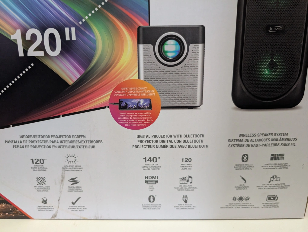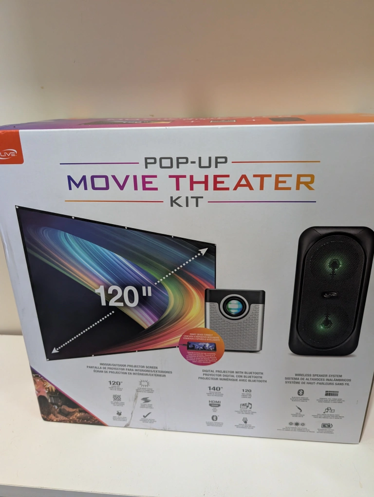 Selling a brand new Pop-Up Movie Theater Kit! It includes a 120" indoor/outdoor projector screen, a digital projector with Bluetooth, and a wireless speaker system. The projector has a 140" projection size and 120 ANSI Lumens. Brand new $140 obo