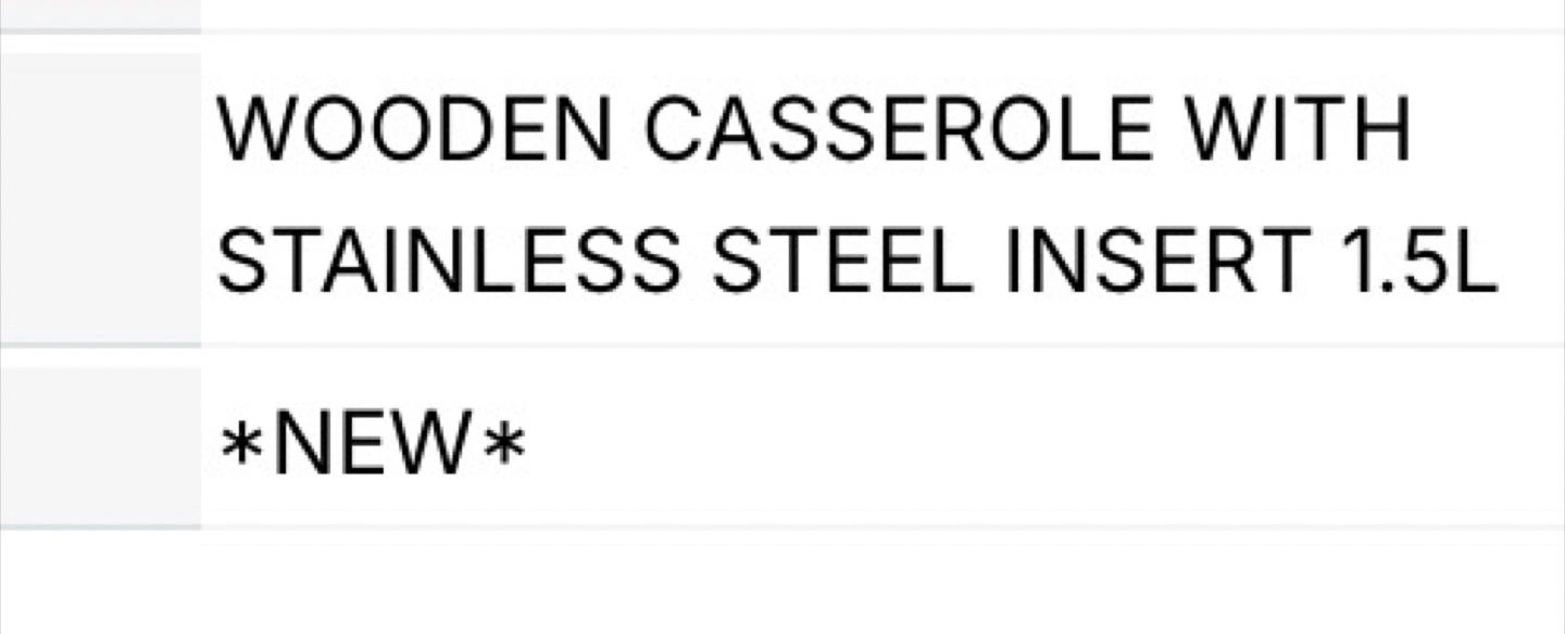 I have a brand new premium wooden casserole for sale! It comes with a stainless steel insert and has a 1.5L capacity. It's a beautiful piece for serving dishes at the table and would make a great addition to any kitchen