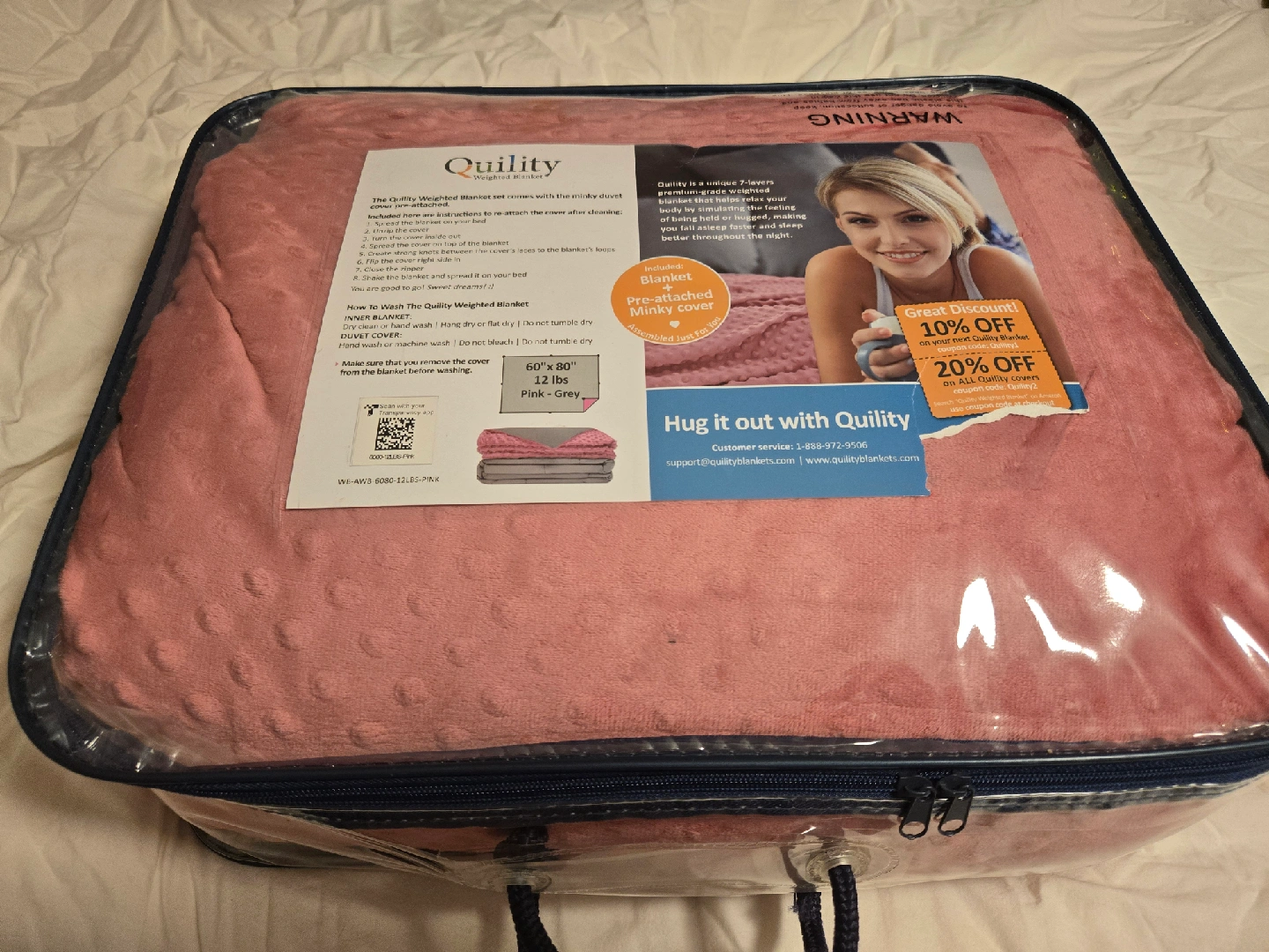 42I have a brand new Quility weighted blanket for sale! It's still in its original packaging and has never been used. It's a 60"x 80" blanket, weighing 12 lbs, and comes in a lovely pink and grey colour. The blanket includes a pre-attached Minky cover. It's designed to help you relax and sleep better by simulating the feeling of being hugged. $50.00 Cash only, Belleville pick up.