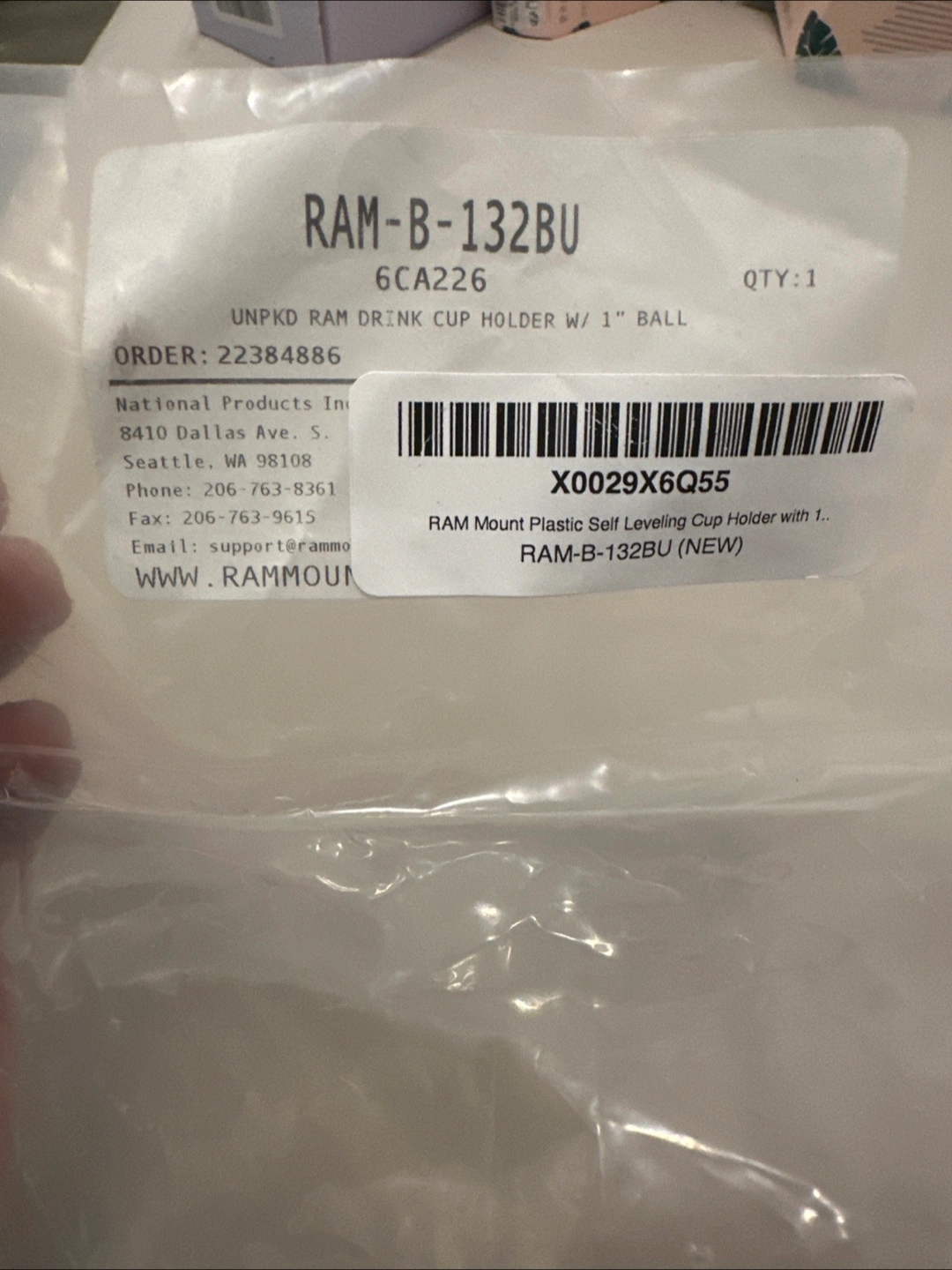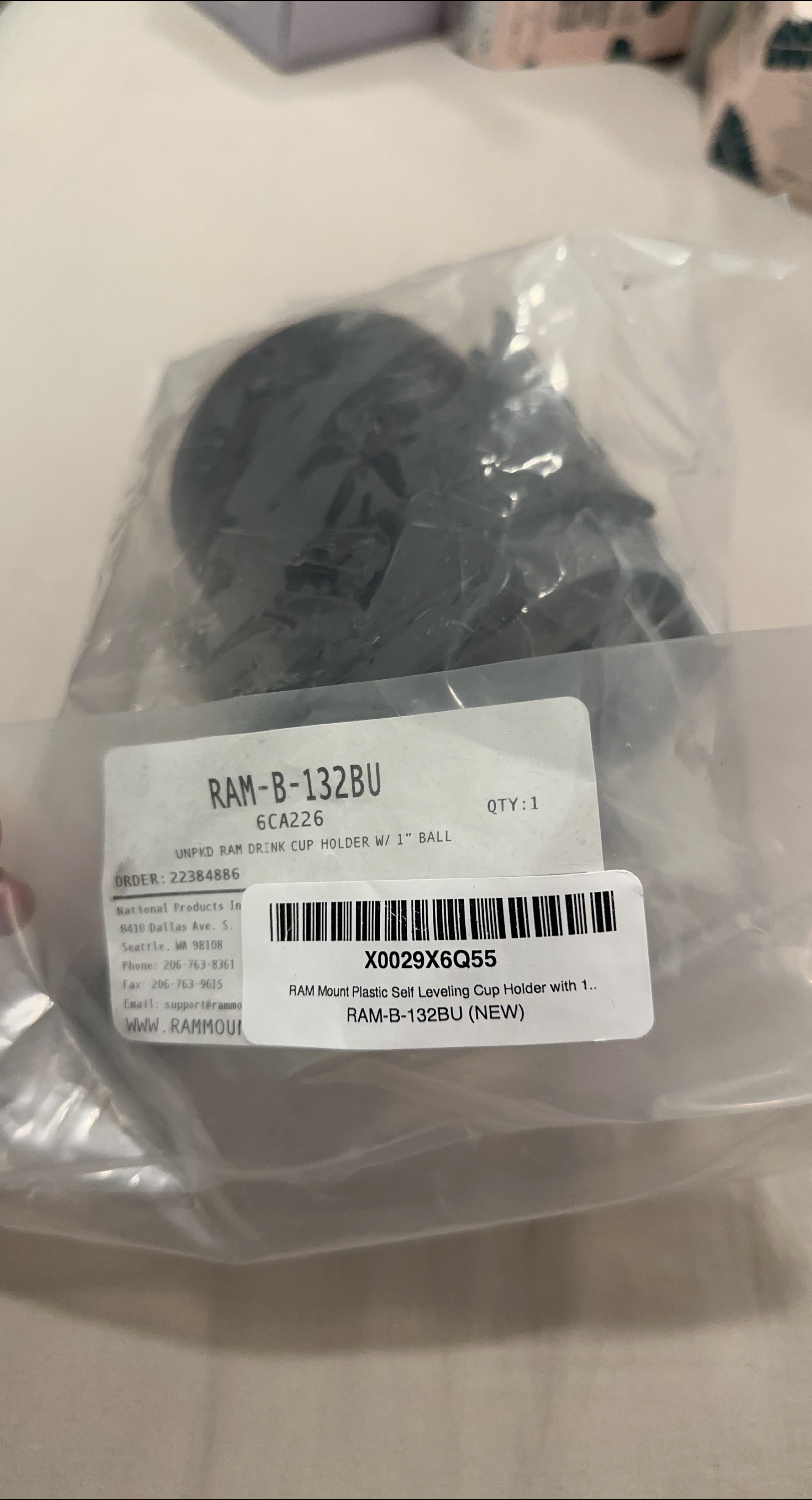 Selling a brand new RAM Mount Plastic Self Leveling Cup Holder with 1" Ball, model RAM-B-132BU. It's still in its original packaging and ready to use!