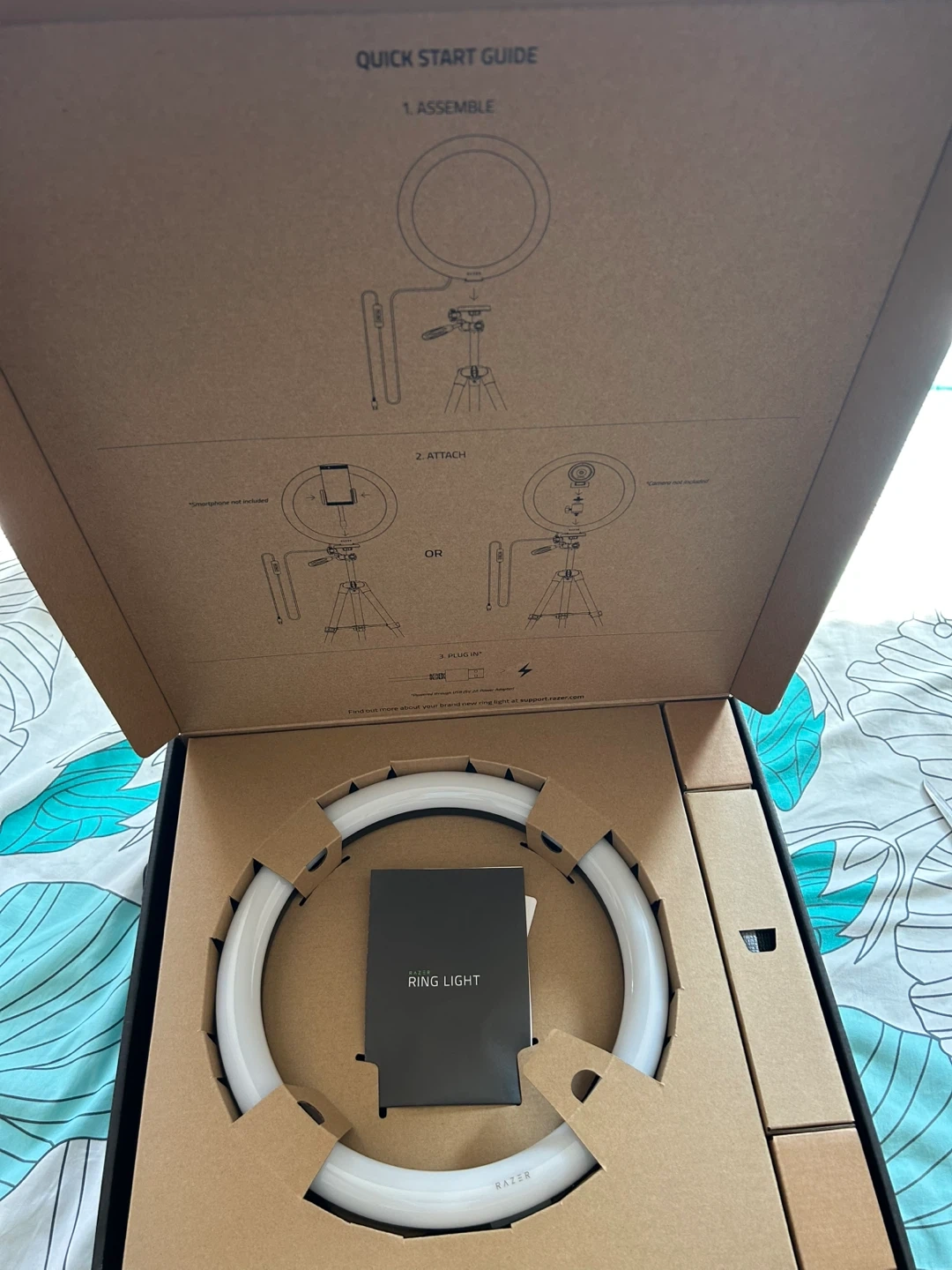 Selling a brand new Razer Ring Light! This 12" USB LED ring light is perfect for PC and mobile streaming. It features customizable light spectrum and adjustable brightness to get the perfect lighting for your setup. Comes with the box and all original components, including the tripod stand and flexible phone mount. It was kept in the sealed box for a year, I only opened the tape today to take the photo for Karrot.