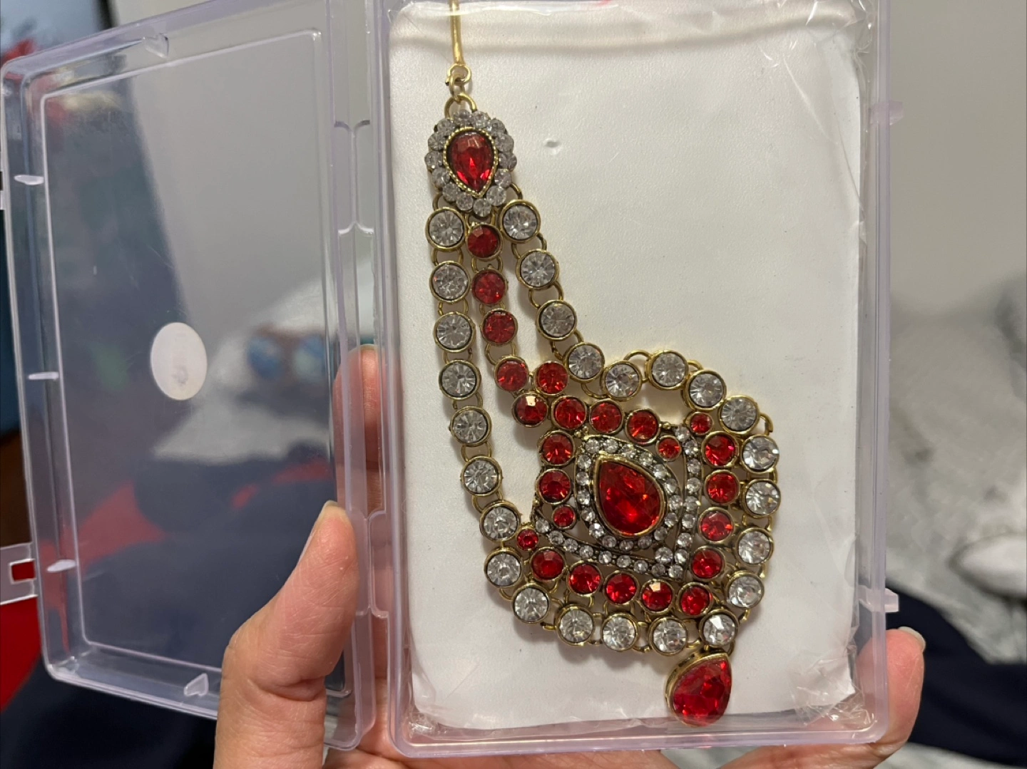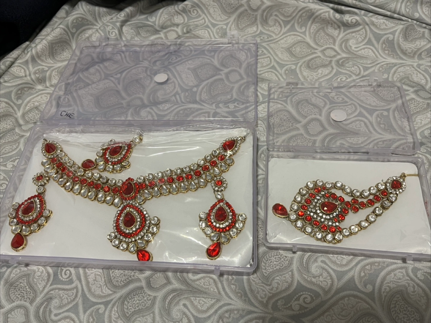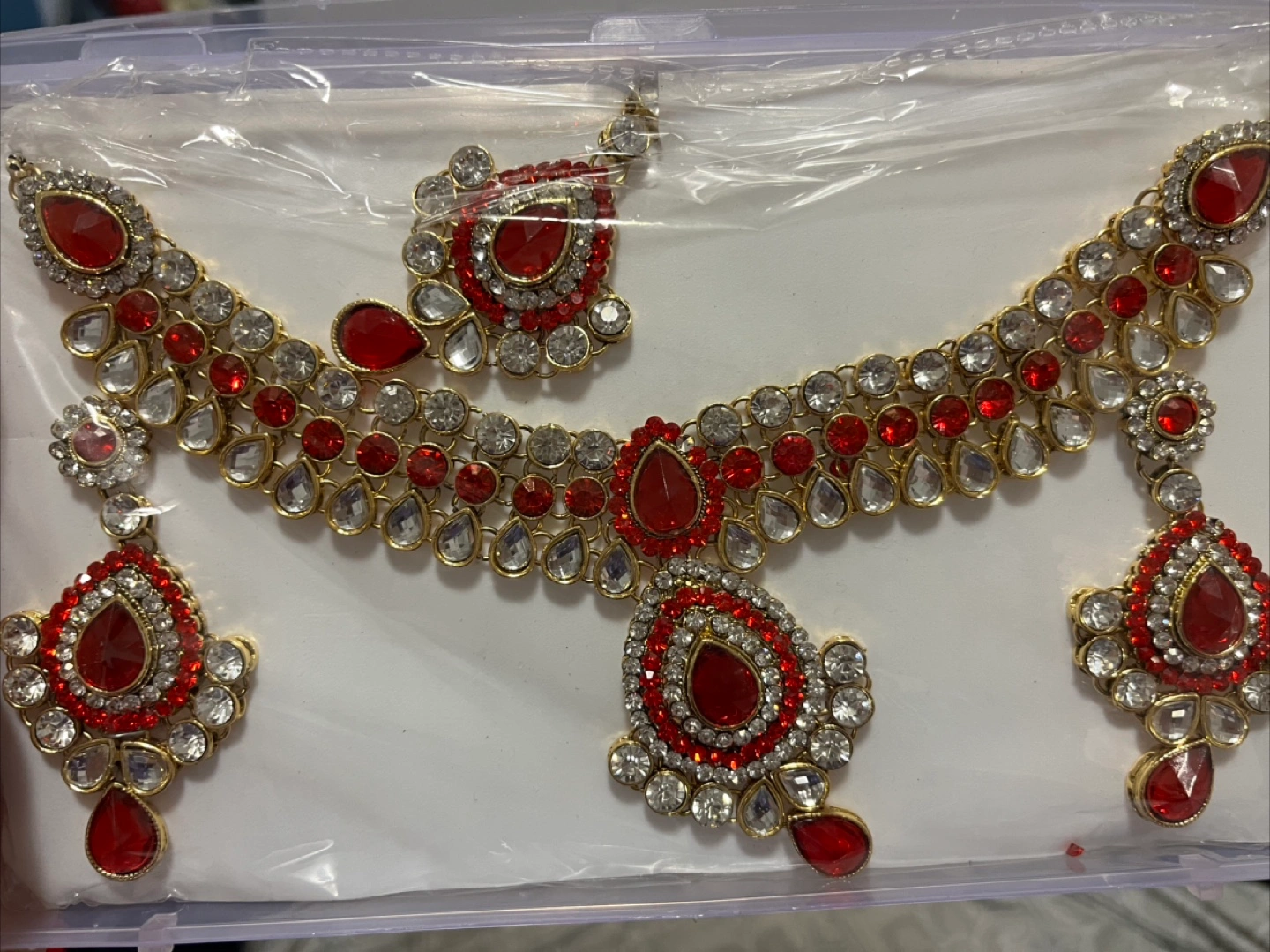 84Selling a brand new jewellery set, complete with a necklace, earrings, and a headpiece. The set features red and white stones set in a gold-tone metal. Comes in its original packaging