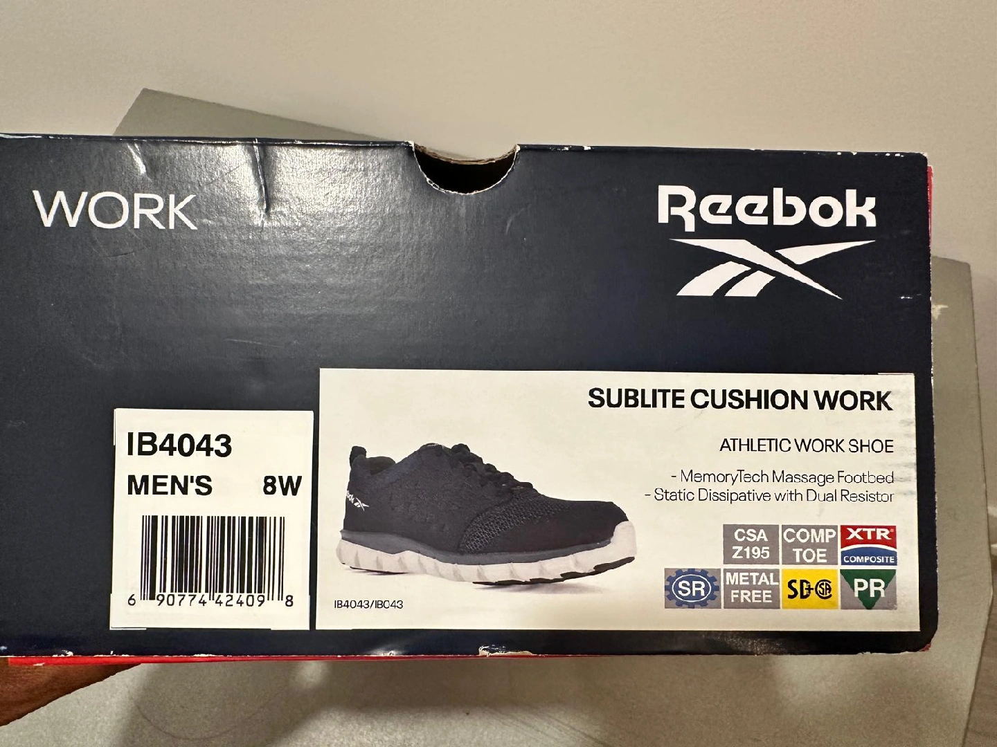 60I'm selling a brand new pair of Reebok Sublite Cushion Work athletic shoes in men's size 8W. They are a navy blue colour. These shoes are designed for comfort and safety on the job, featuring MemoryTech Massage footbed and static dissipative with dual resistor. The box is included!