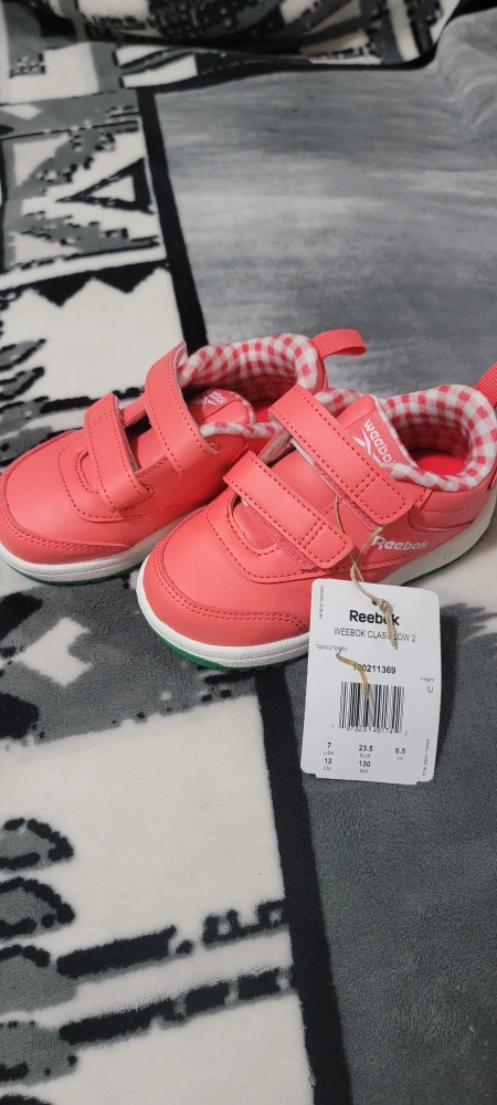 65These adorable Reebok Weebok Class Low 2 infant shoes are in excellent condition! They're a lovely coral colour and feature a convenient velcro closure. The size is US 7, EUR 23.5, and 13 cm. Perfect for your little one!