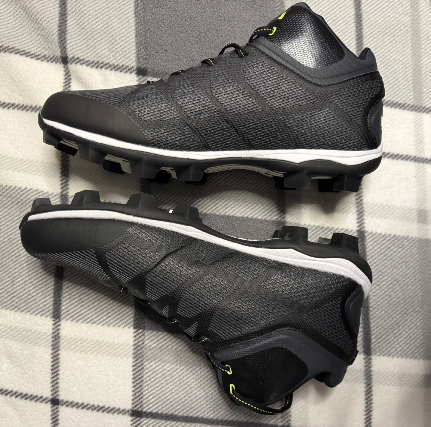 600New black and grey football cleats. Adult size 13. Lace-up closure. Durable rubber sole.