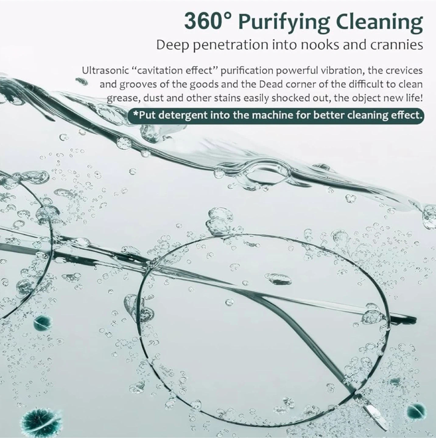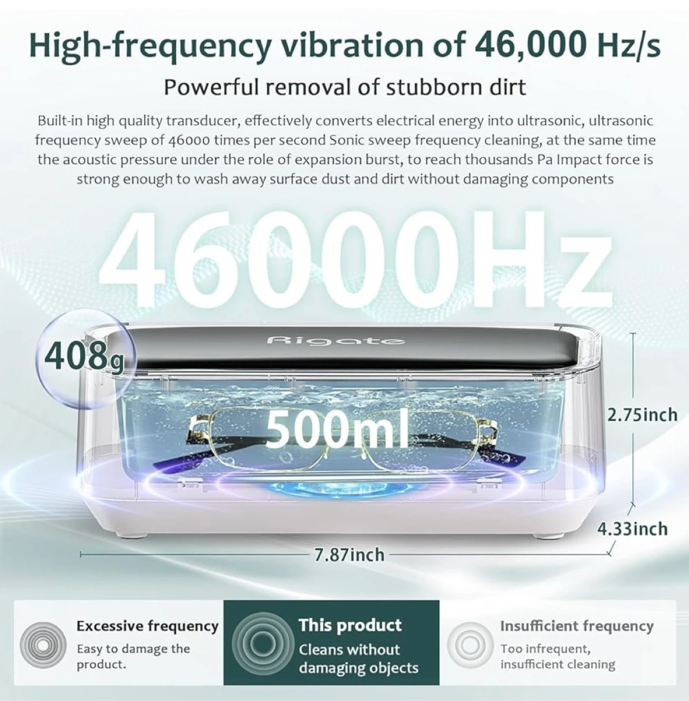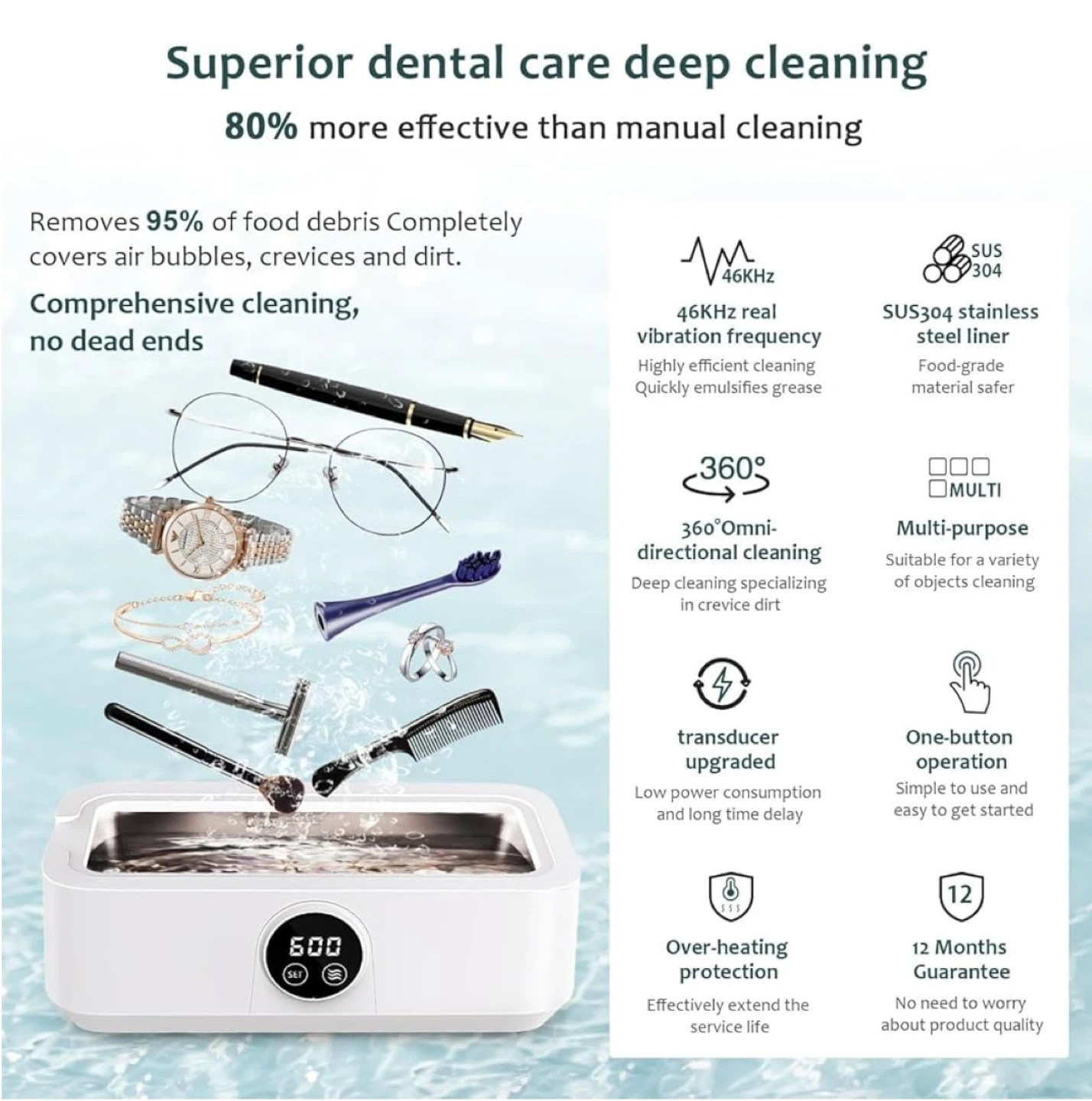 * 46KHz High-Frequency Deep Cleaning Technology - Achieve 360° thorough cleaning with 46,000Hz ultrasonic vibrations, generating microscopic bubbles to remove dirt, grease, and grime from jewelry, eyeglasses, watches, and delicate metal items without scratching surfaces. * Energy-Efficient & Compact Design - Combines 24W low power consumption with a 500ml tank for eco-friendly, cost-effective cleaning. Perfect for home, travel, or small businesses—ideal for jewelry collectors, parents, or professionals cleaning dentures, razors, or grooming tools. * 3 Adjustable Timers (180S/300S/600S) - Customize cycles for diverse needs: 180S for quick jewelry refresh, 300S for makeup brushes, or 600S maximum power for stubborn stains on watch bands and orthodontic devices. [Durable & Safe Construction] Built with SUS 304 food-grade stainless steel tank and shock-resistant ABS housing. Non-slip base and detachable power cord ensure stability and convenience during use. * Multi-Scene Cleaning Basket & One-Touch Operation - Includes a removable mesh basket to secure small items like earrings and chains. Effortless one-button start—no manual reading required—for seniors, travelers, or busy users.