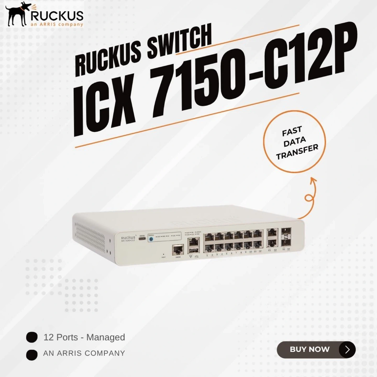 Selling a brand new Ruckus ICX 7150-C12P switch This is a 12-port managed switch from Ruckus, perfect for fast data transfer. All hardware is included and still sealed in the packaging. It has a silent operation with high performance speed perfect for any space.