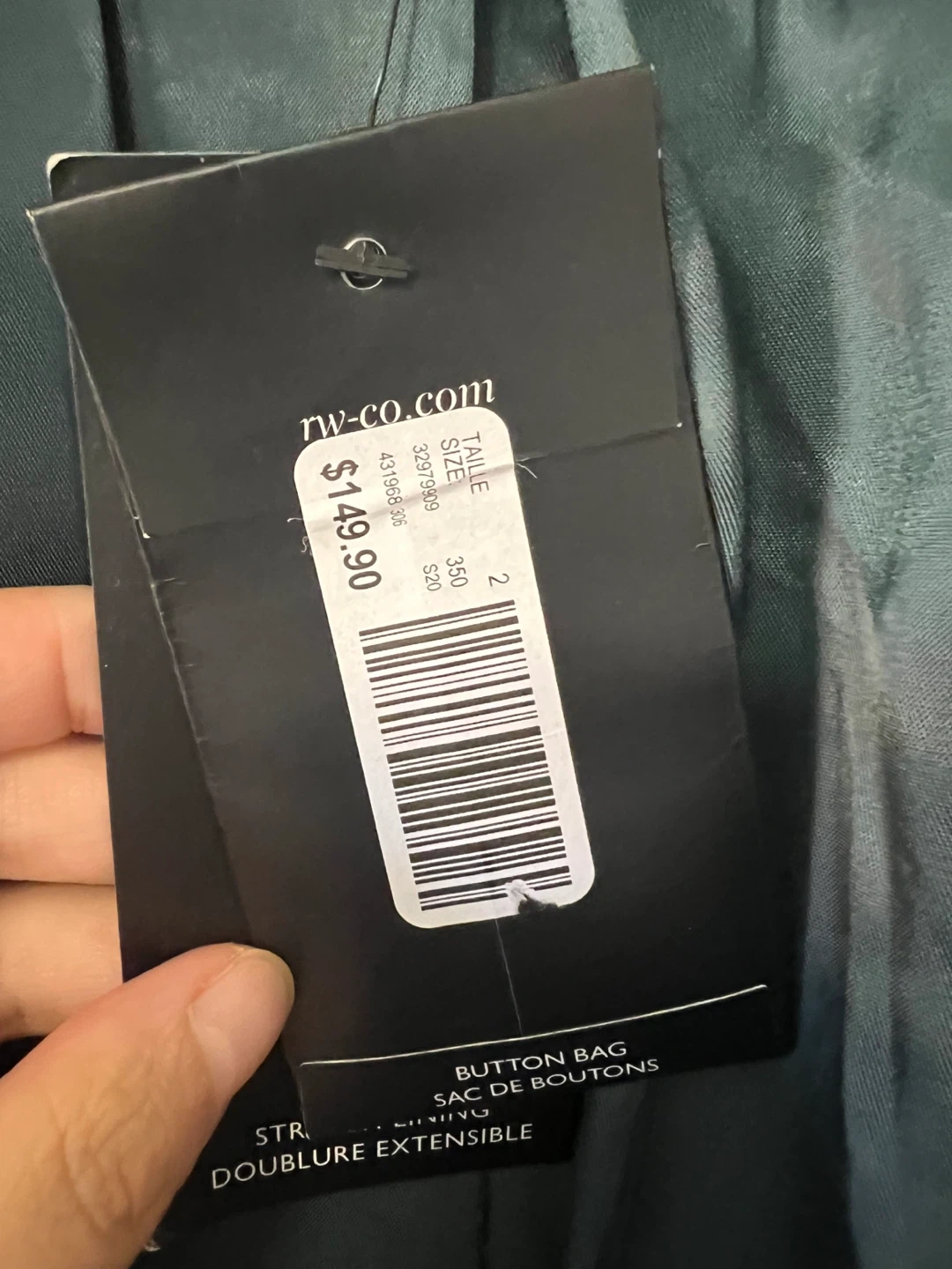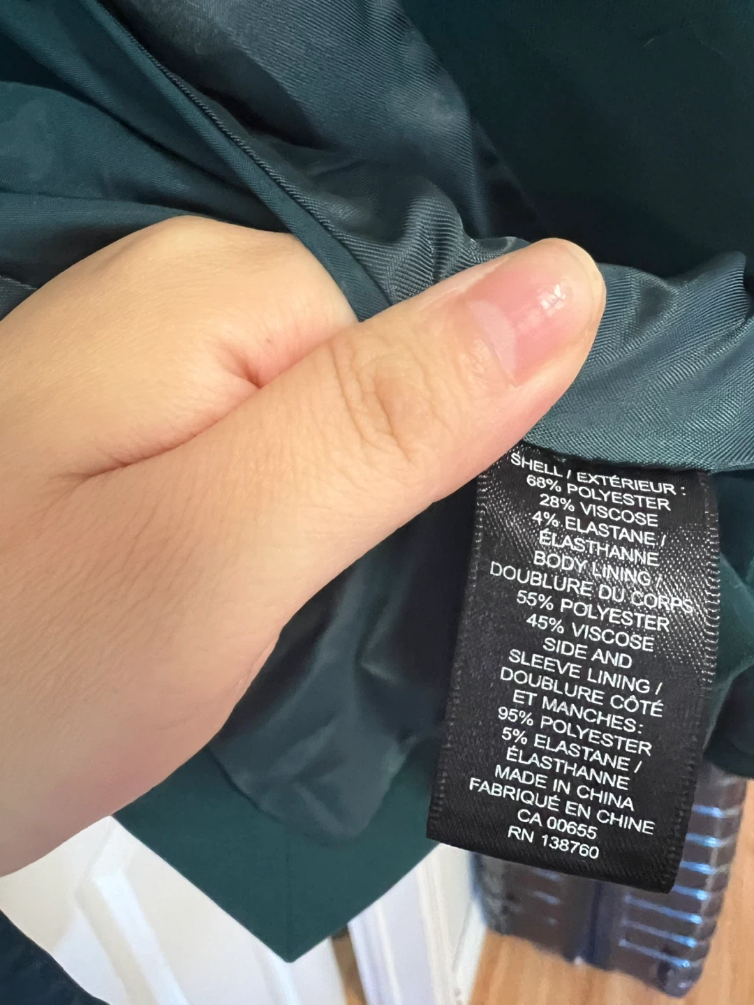 198Selling a beautiful RW&CO. suit in a rich green colour! The jacket is a size 2, and the pants are a size 4. The suit features a stretch lining for extra comfort. The shell is made of 68% polyester, 28% viscose, and 4% elastane.