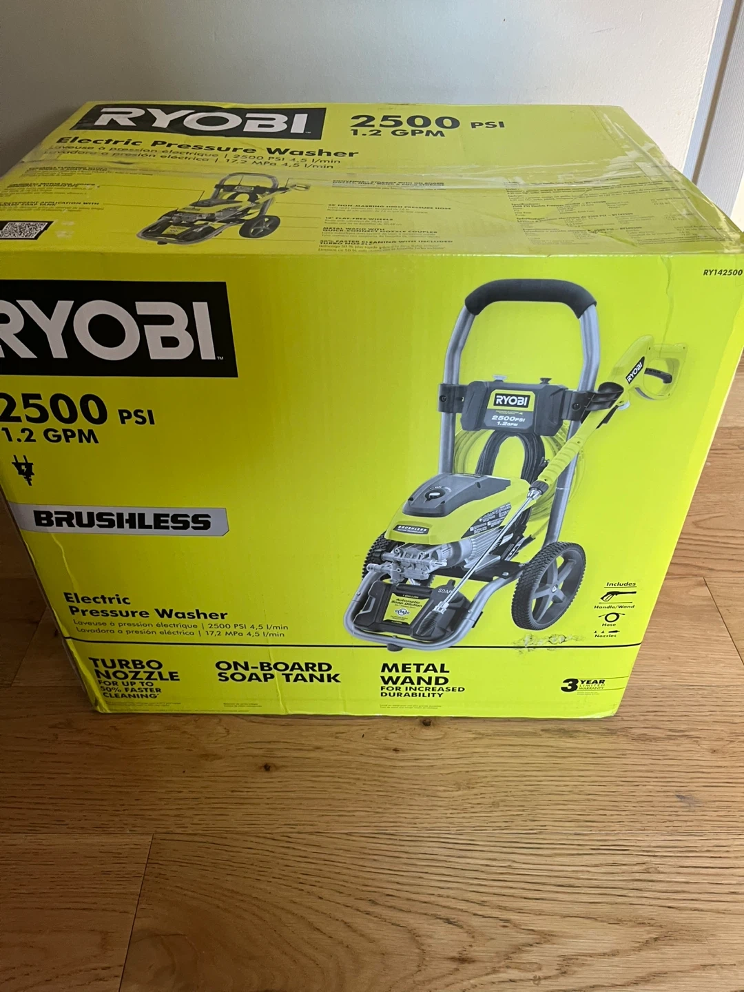 18Selling a brand new Ryobi 2500 PSI electric pressure washer! It's still in its original box and includes the handle/wand and nozzles. This model features a brushless motor and delivers 1.2 GPM. Also has a turbo nozzle for up to 50% faster cleaning and an on-board soap tank for added convenience!