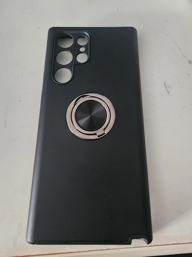 Selling a black phone case for a Samsung Galaxy S22 Ultra. It's in great condition and has a ring stand attached for easy grip and viewing. Perfect for protecting your phone! Lightly used. Selling because I don't like the color.