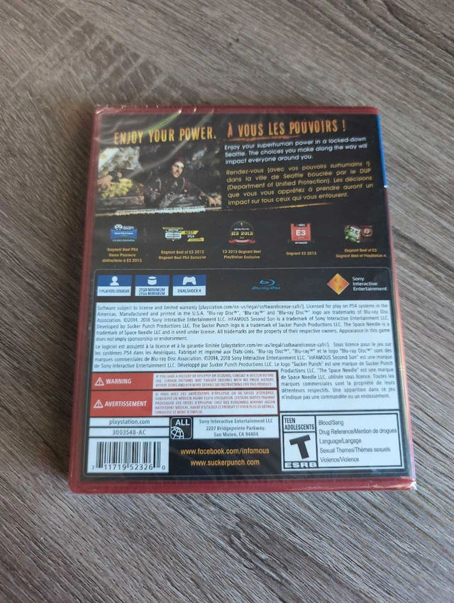 Dive into the immersive world of Infamous: Second Son on PS4 with this brand-new, sealed copy, promising hours of electrifying gameplay and stunning visuals. This sealed copy is ready to be added to your collection, but I have too many games and need to clear out some space. It's hard to let this one go. If the ad's still up, yes, it's available!