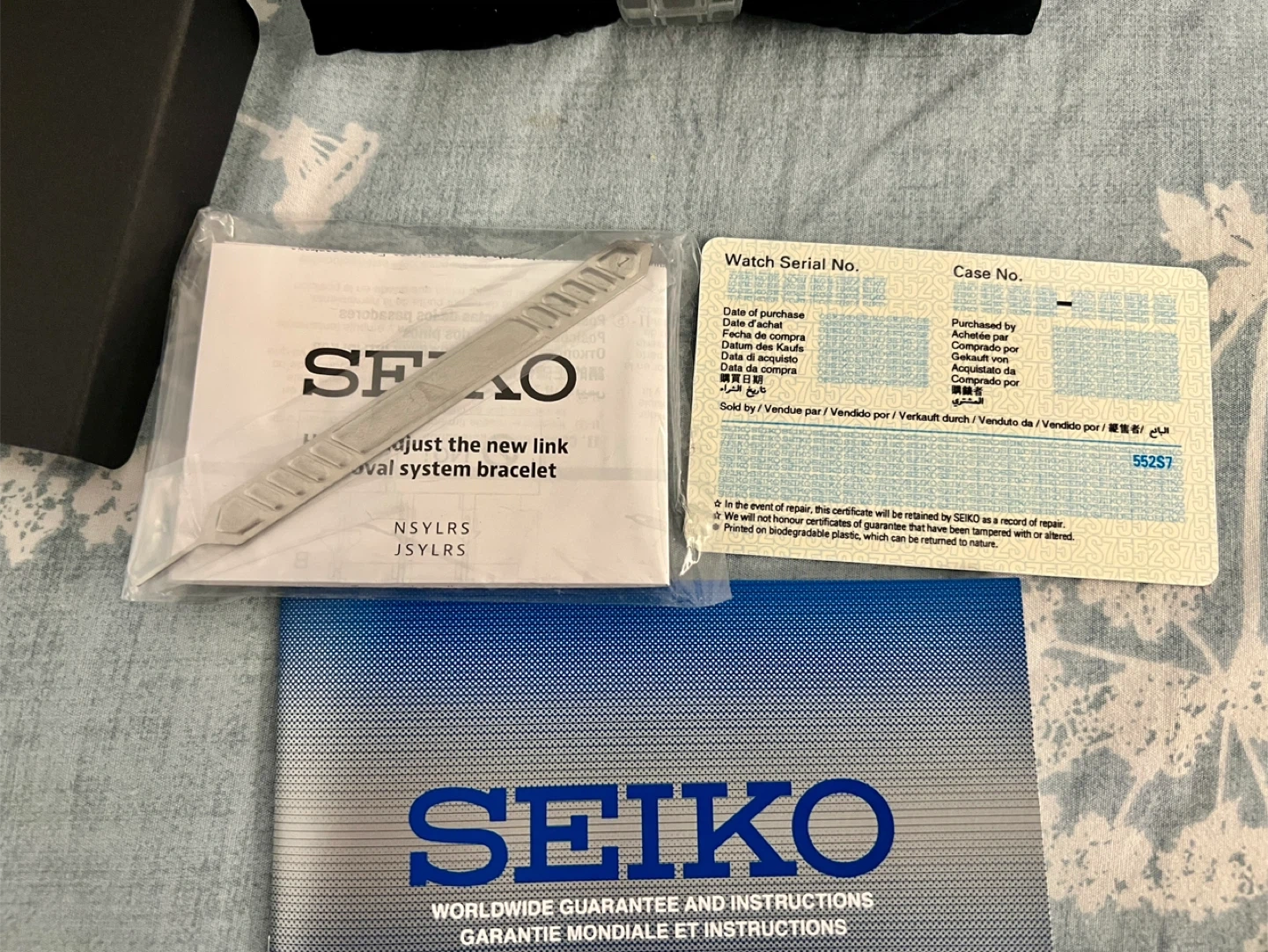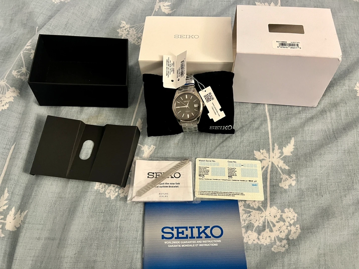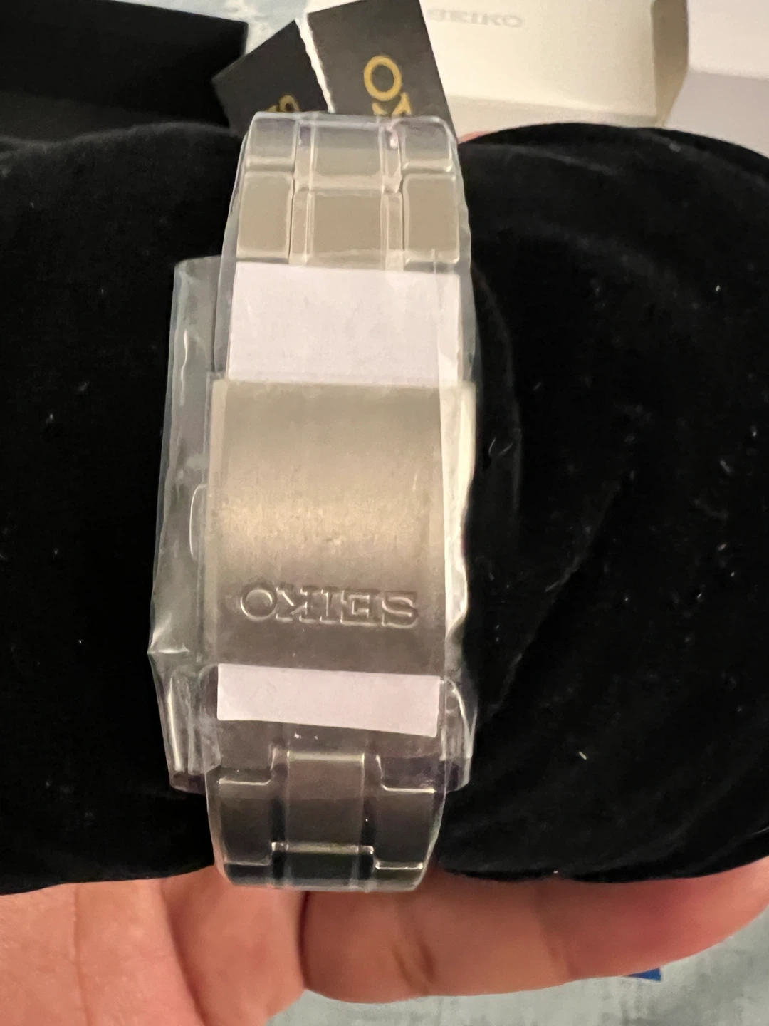 Selling a brand new Seiko SUR375P1 watch! It features a sapphire crystal and is water resistant to 100m. The case and bracelet are made of titanium, and it has LumiBrite for enhanced visibility. Comes with the box, papers, and a tool to adjust the new link system bracelet