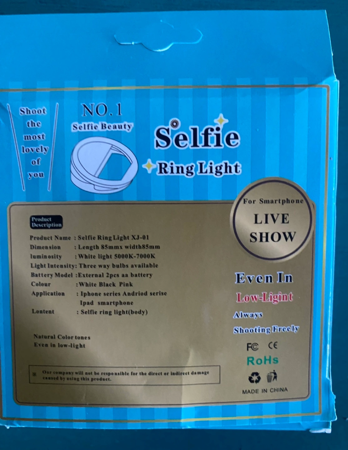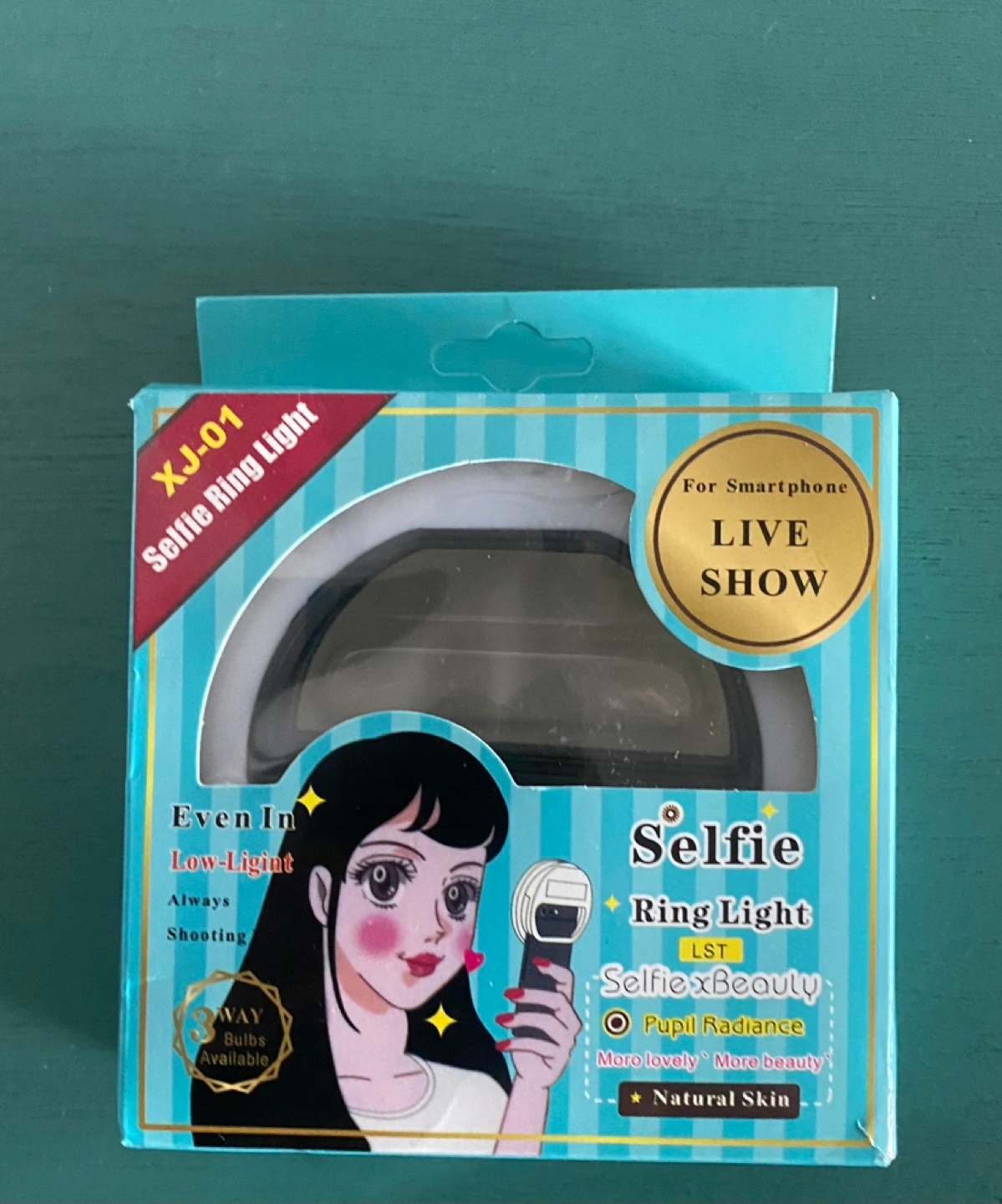Selfie ring light with three light bulbs. Even in low-light, always shooting freely. For smartphone live show. Natural skin.
