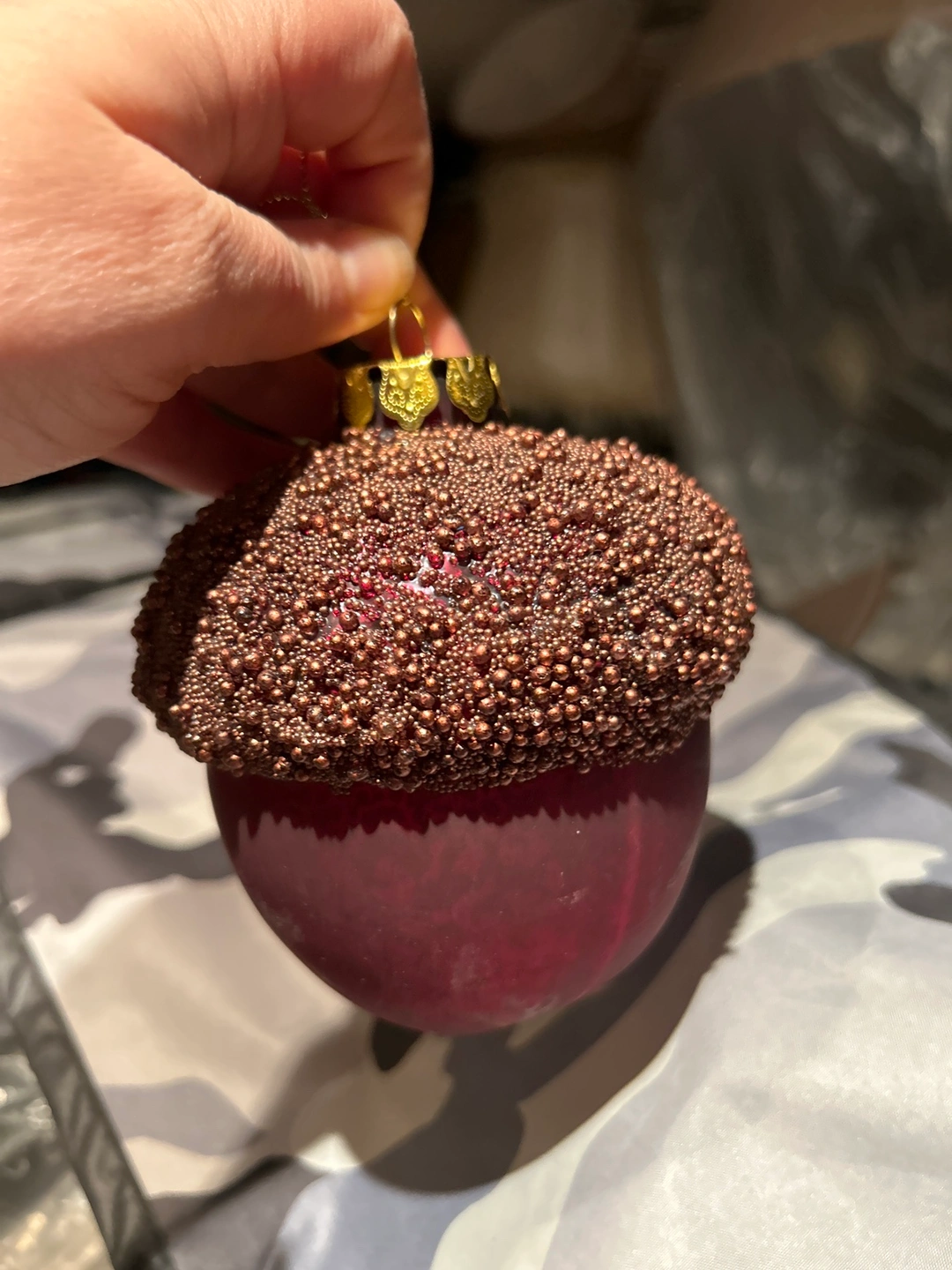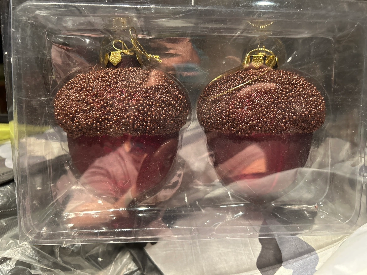 New Set of two glass acorn Christmas ornaments. They have a burgundy finish and are covered in small copper beads. Retail price 8$, asking 5$ per box of 2. I have 3 boxes