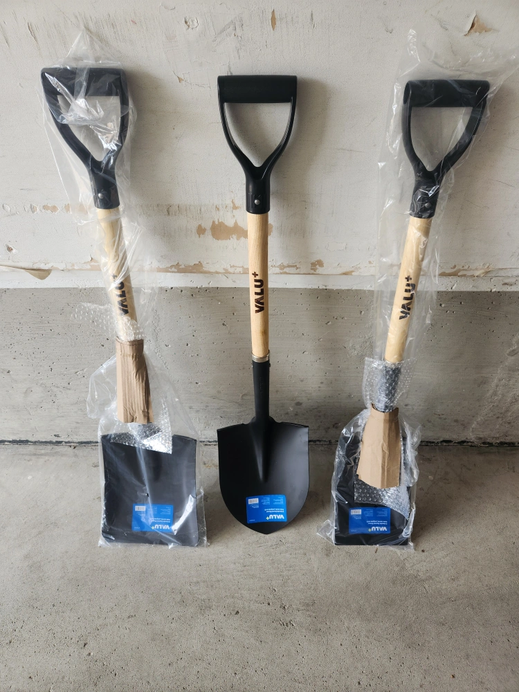 Selling three brand new shovels There are two square shovels and one round shovel, all still in their original packaging. Perfect for gardening or any digging project! Only $15 each