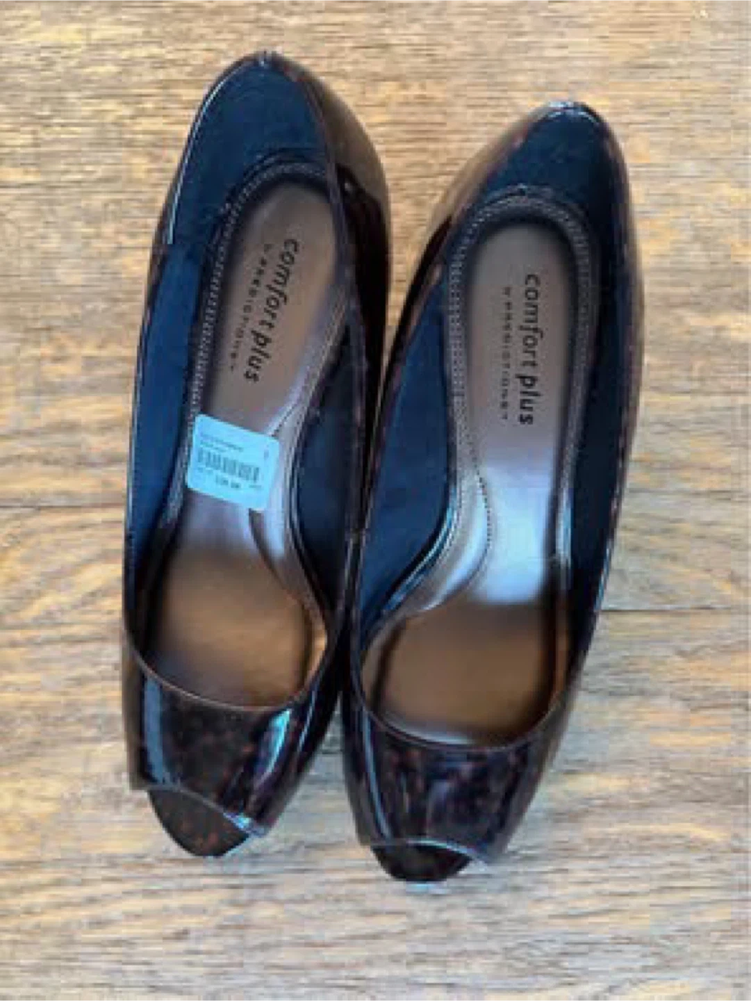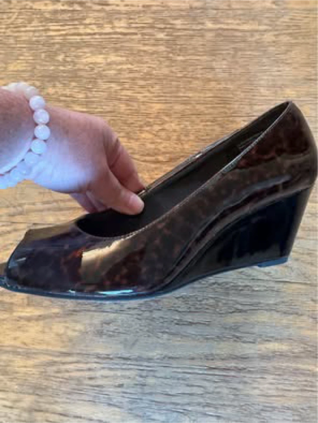 New, never used (just tried on). Very comfortable brown and black beautiful wedge heels with peep toe.