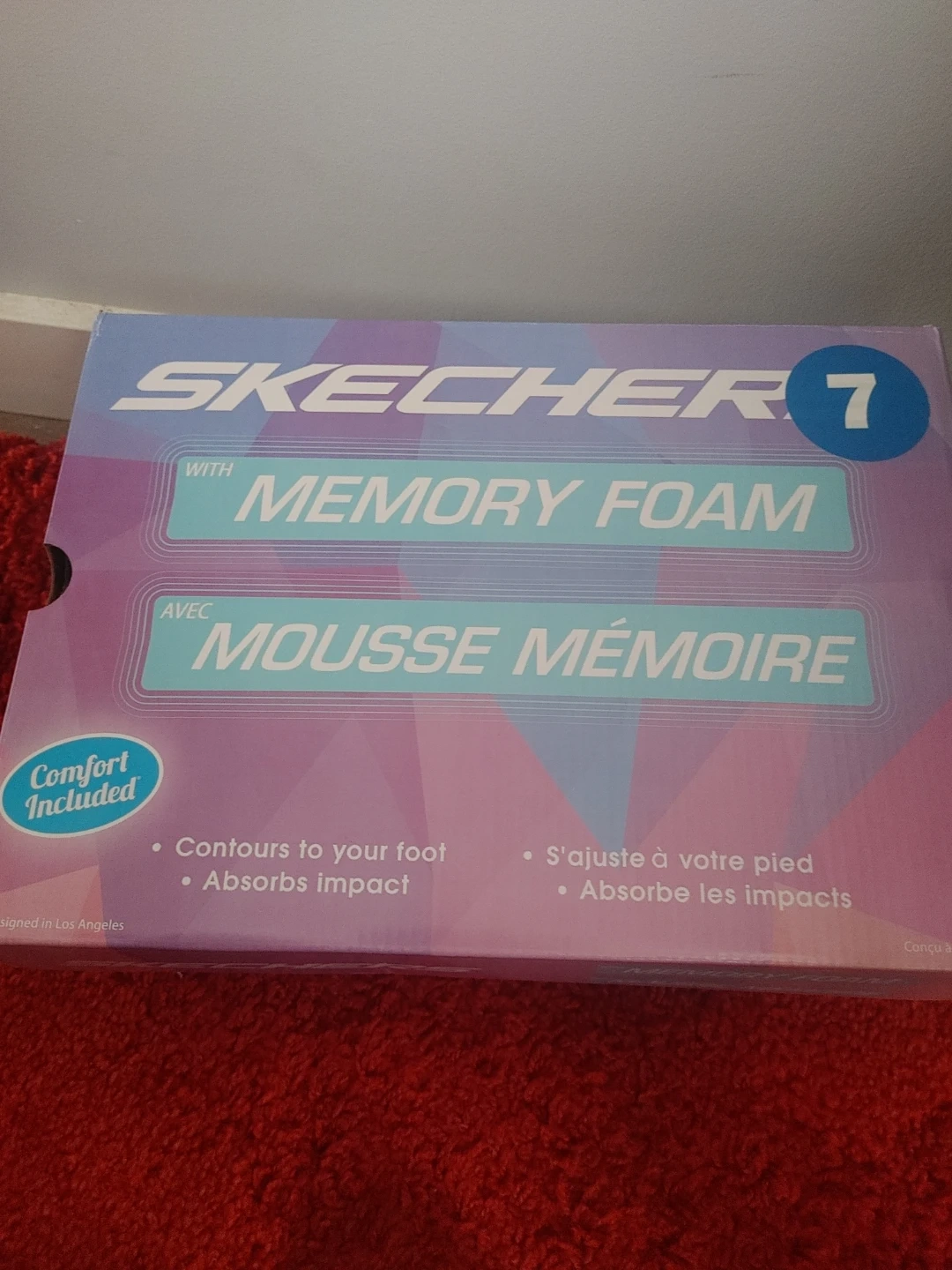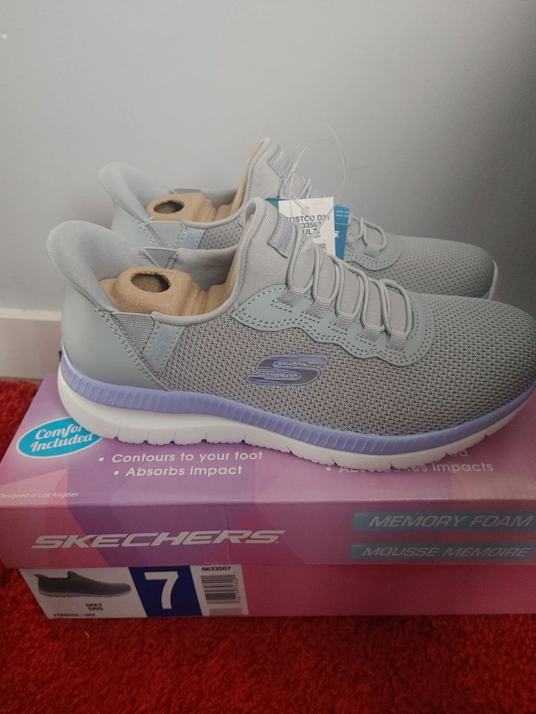 23These are a brand new pair of Skechers memory foam shoes in grey, size 7! They contour to your foot and absorb impact, making them super comfy. The box is included as well. Washable.