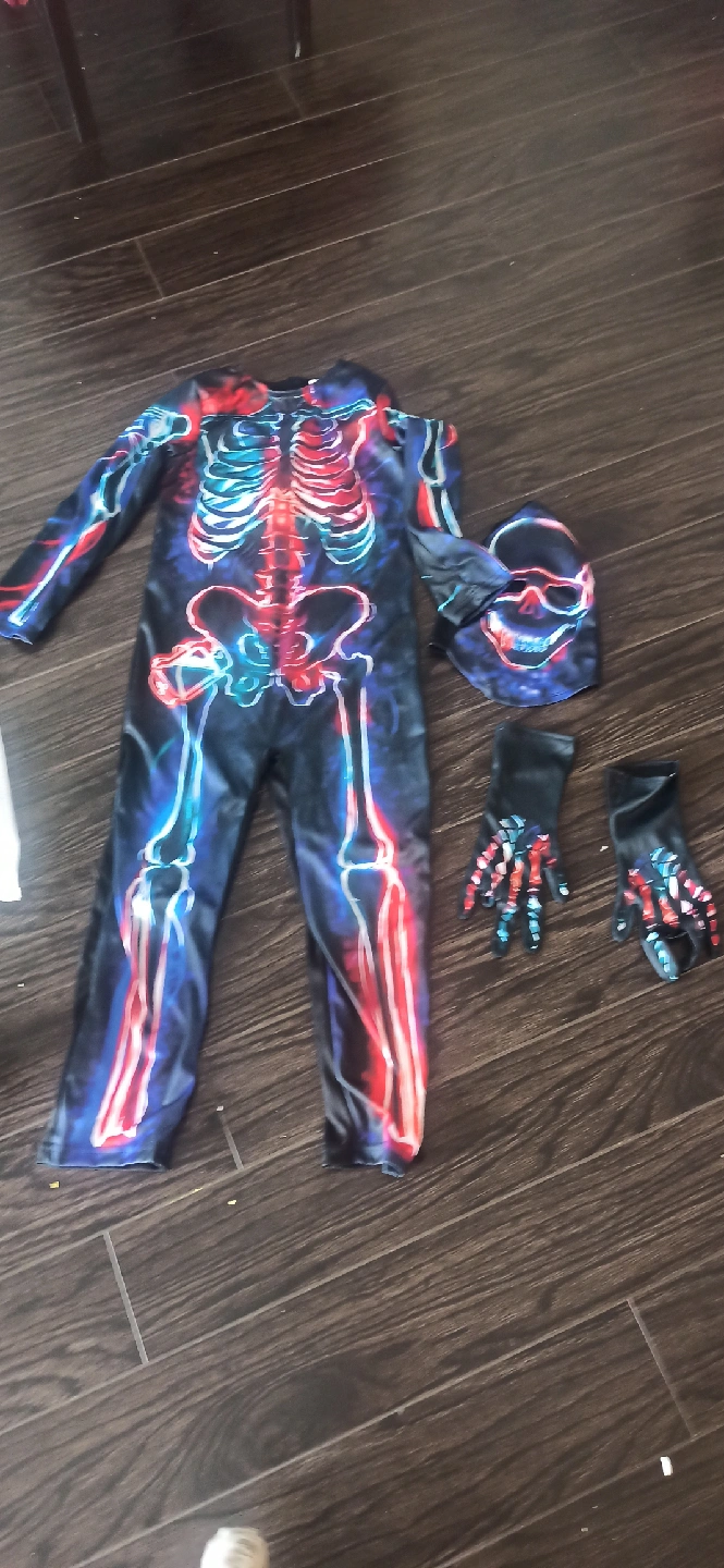 86Selling a cool skeleton costume! It comes with the full body suit, a mask, and gloves, all with a glow-in-the-dark skeleton design.Size 7-8yrs