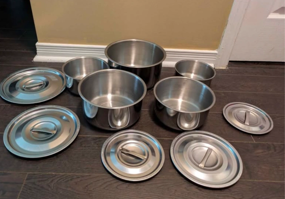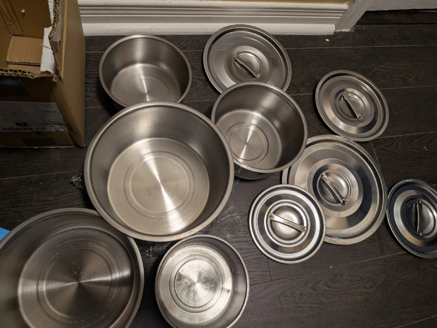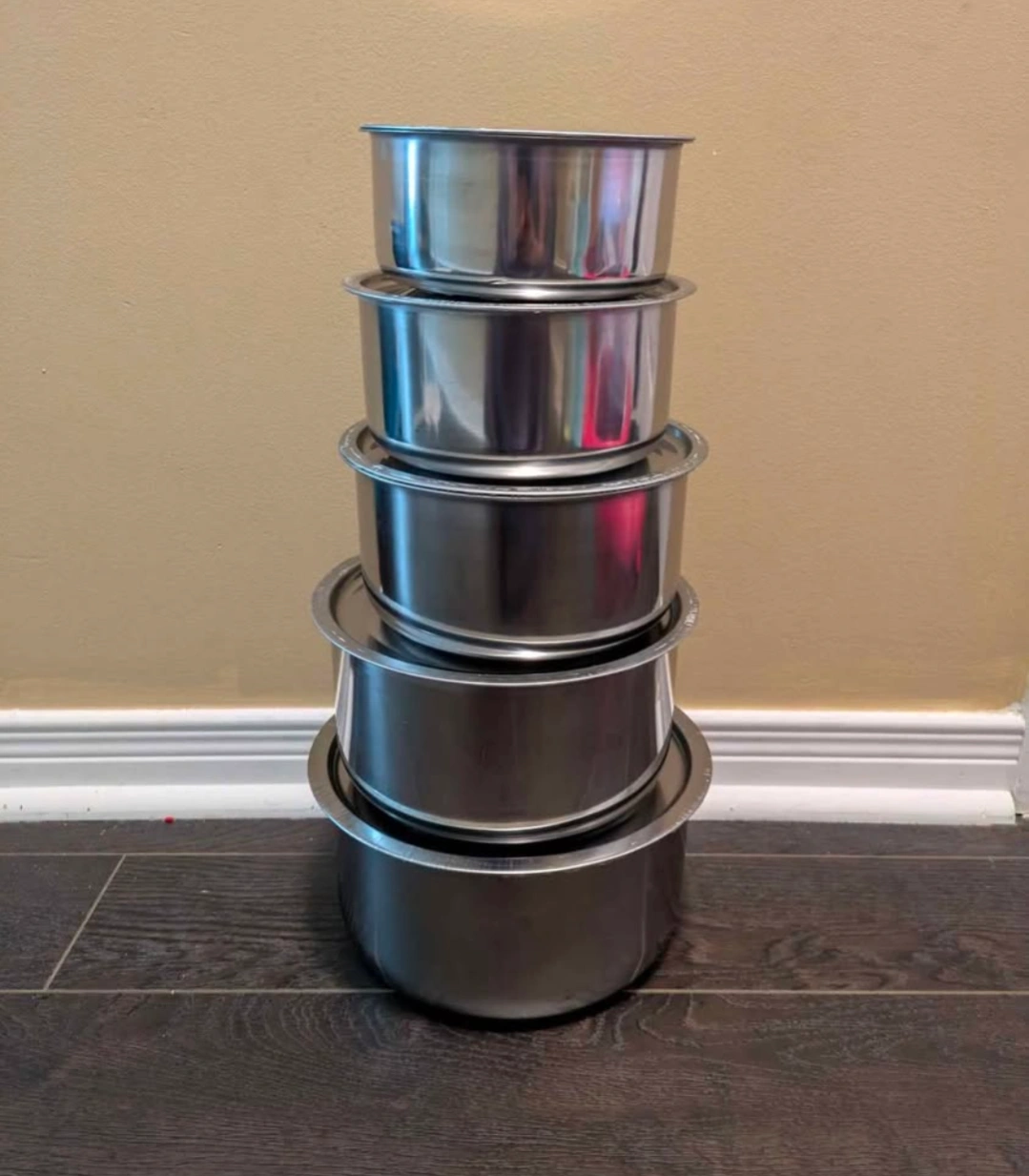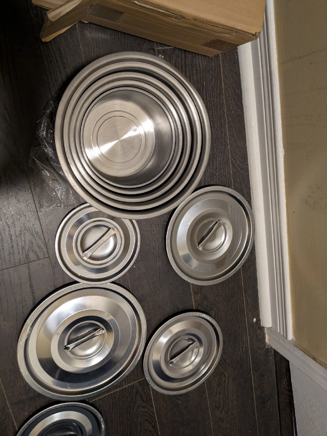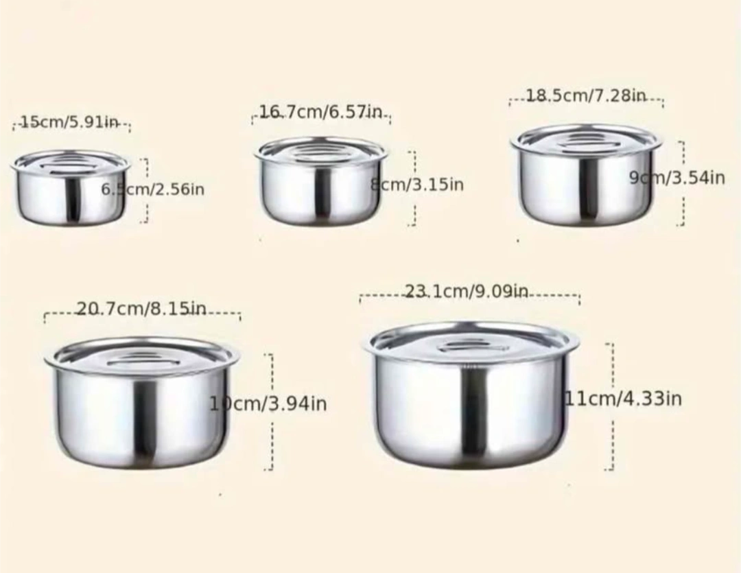 Selling a set of 5 stainless steel nesting mixing bowls. They are in great shape and ready for a new kitchen! The bowls nest for easy storage. Dimensions are approximately: - 15cm/5.91in - 16.7cm/6.57in - 18.5cm/7.28in - 20.7cm/8.15in - 23.1cm/9.09in