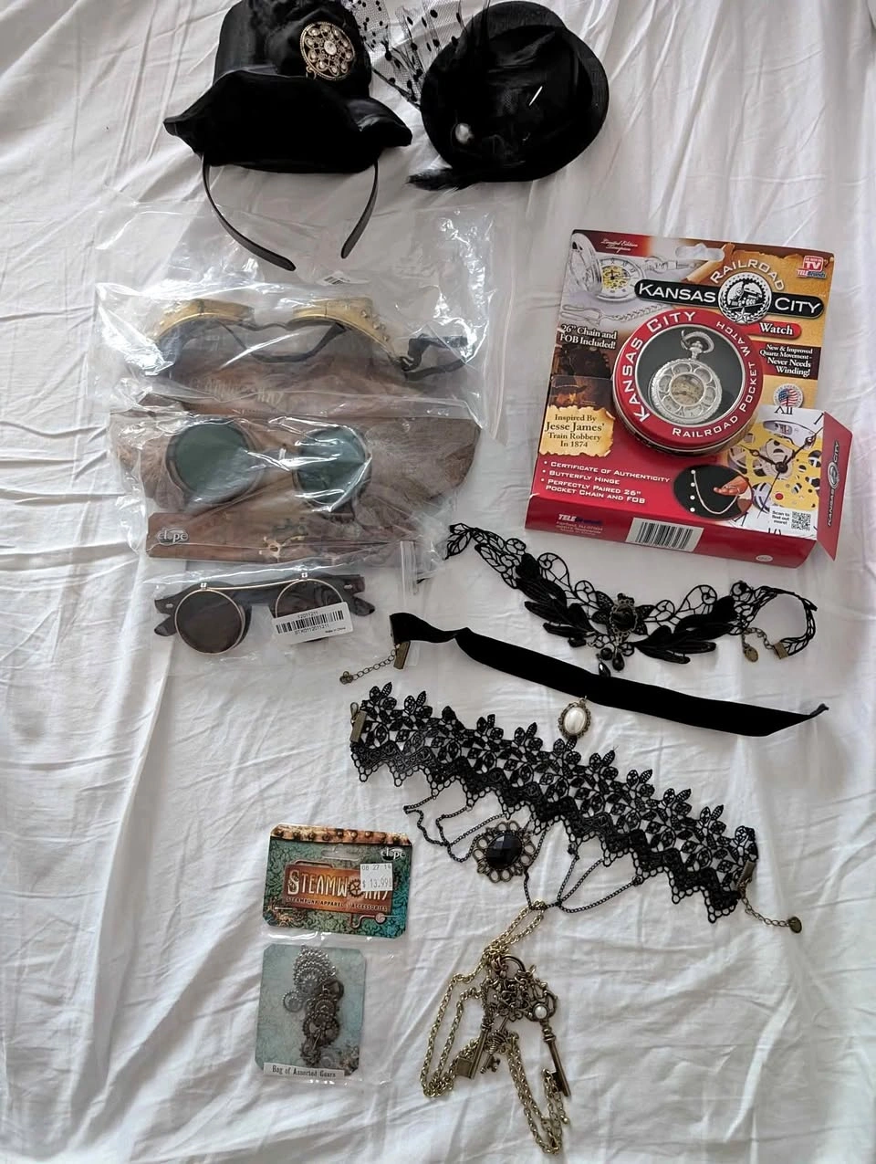 101Selling a collection of steampunk-themed accessories! Includes hats, goggles, necklaces, and a Kansas City Railroad pocket watch. Perfect for completing your steampunk look or adding a unique touch to any outfit.