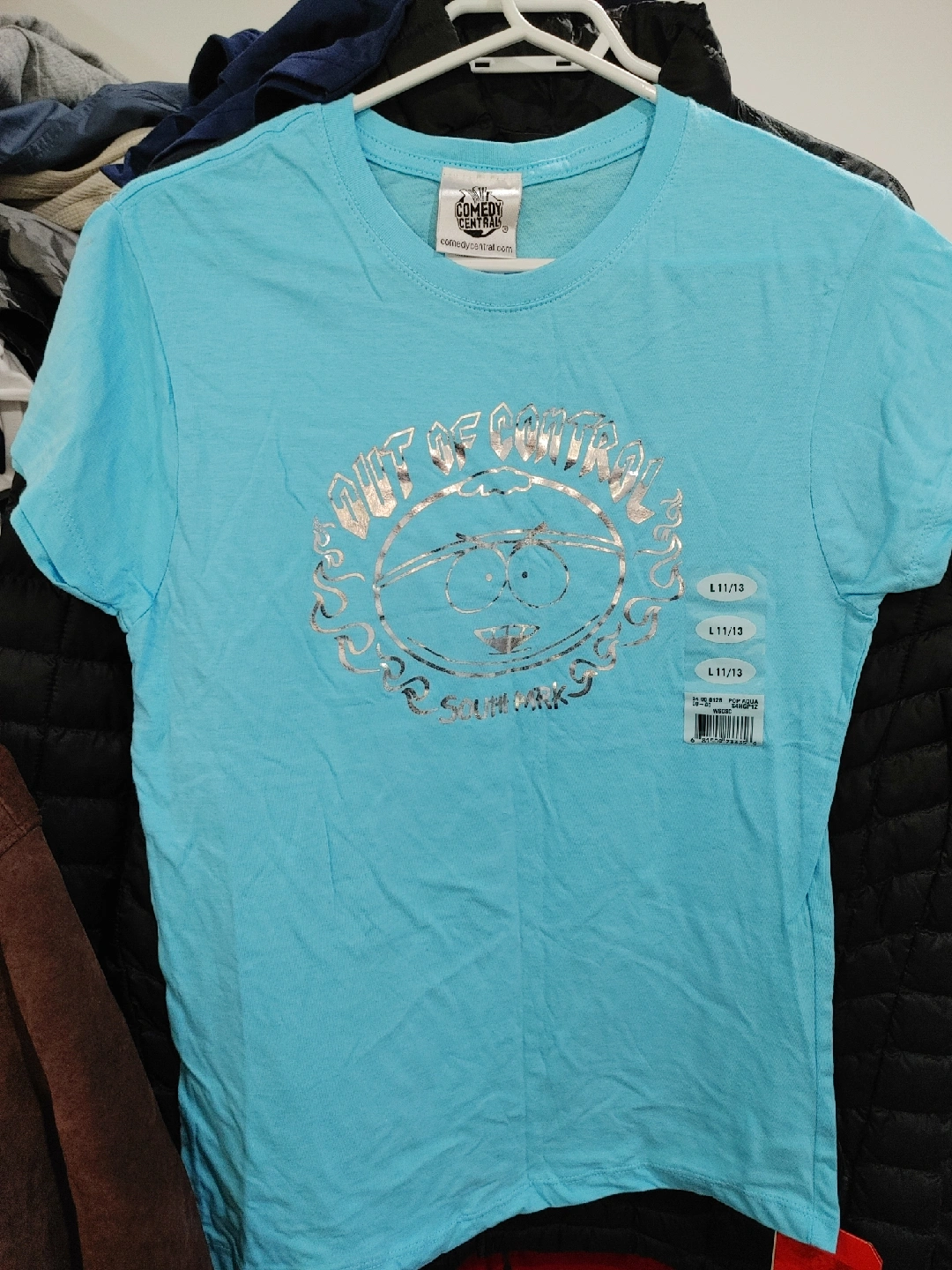 🧡SUPER RARE SOUTH PARK CARTMAN T-SHIRT! 🧡"OUT OF CONTROL" IS PRINTED ABOVE A FEISTY CARTMAN.🤣 🧡WOMENS SIZE LARGE. 🧡 TURQUOISE COLOUR 🧡BRAND NEW. 🧡I AM LOCATED IN THE YONGE AND STEELES AREA FOR PICKUP.