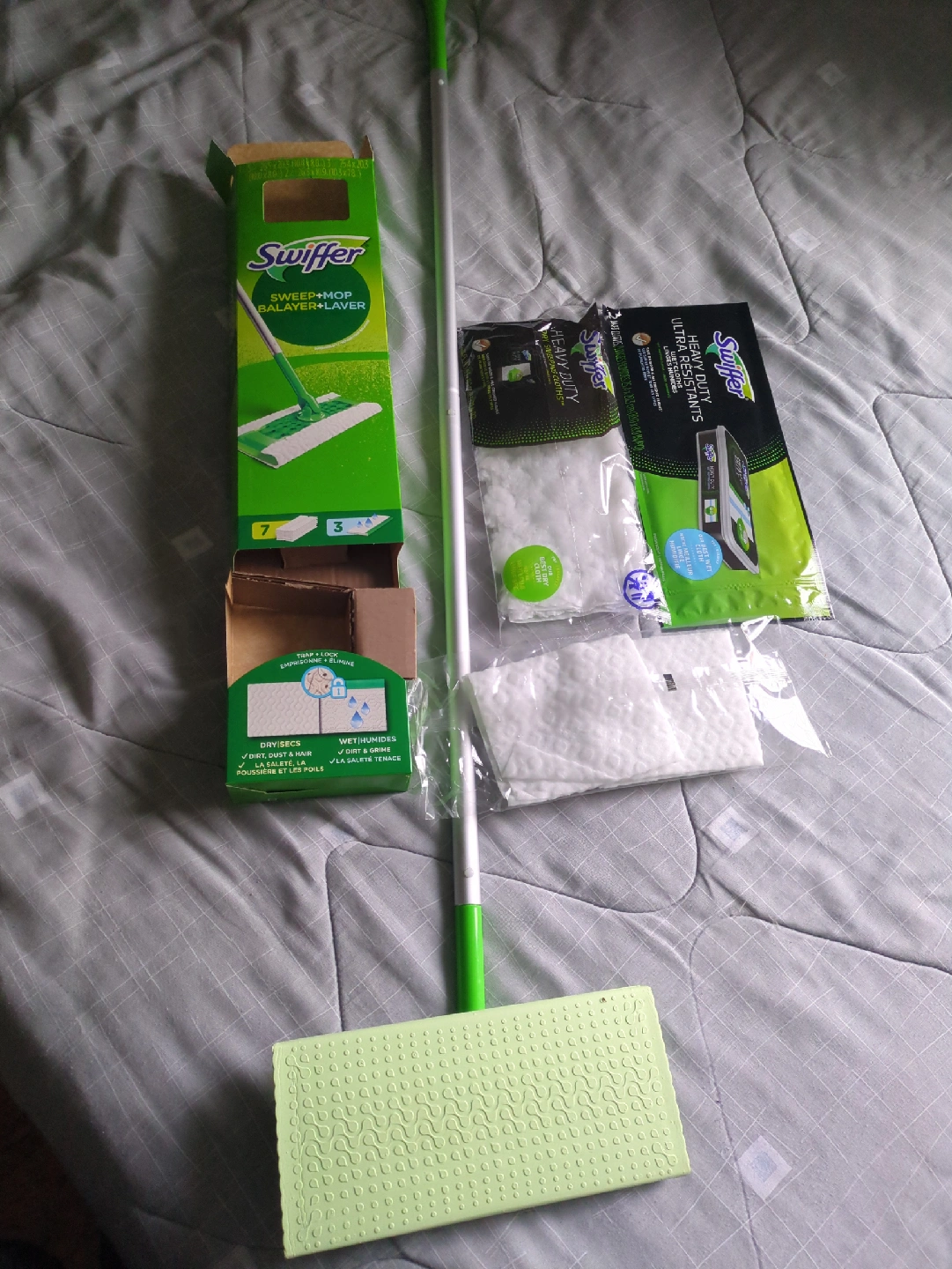 Selling a new not used Swiffer PowerMop Floor Cleaner kit! It comes with the mop, some wet cloths, and some dry sweeping cloths. The box is included as well