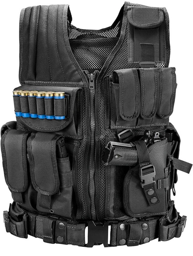 91SMALL / MEDIUM Tactical Vest in black is designed for durability and functionality, featuring multiple pouches for magazines, a holster for pistols, and adjustable straps for a custom fit. Perfect for airsoft, paintball, or tactical training. Here are some of its features: * Adjustable shoulder panels * Reinforced rescue pull hand * Modular webbing velcro (detachable) * Molle system * Adjustable torso strip * Rubber grip shoulder shooting pad * Radio/phone pouch * Equipment pouch (detachable) * Accessory pouch (detachable) * Holster for pistols (detachable) * Flashlight/knife pouch * Mag flashlight pouch * Adjustable belt with 2 pouches Condition: New