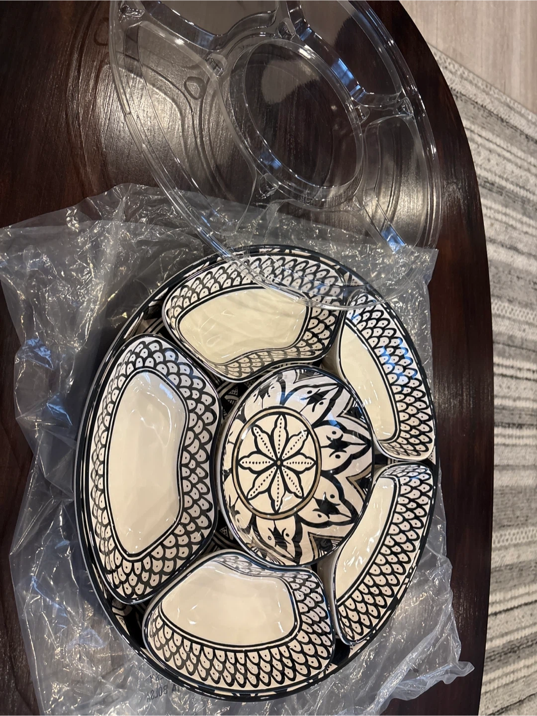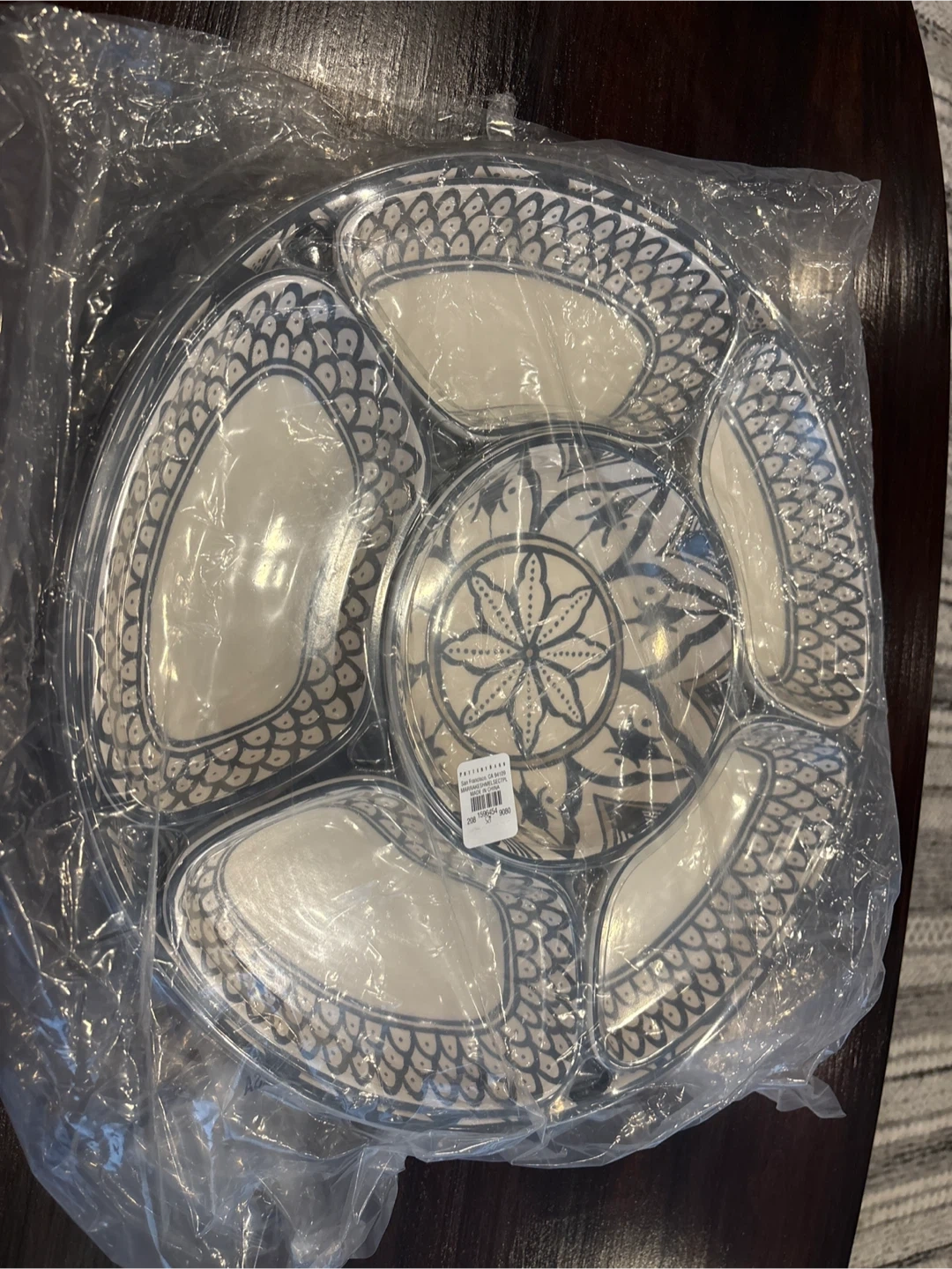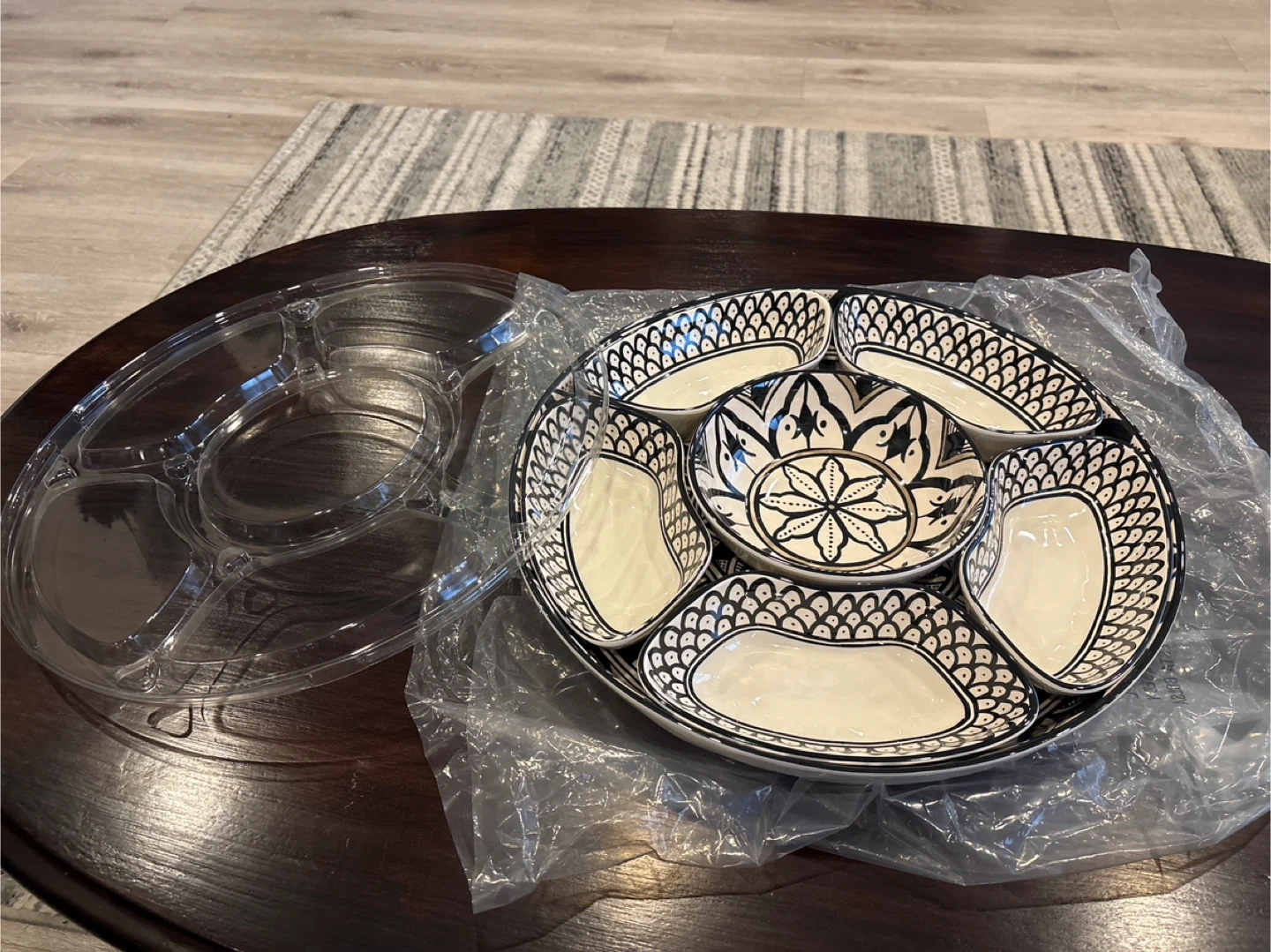 17I have a brand new Tagine round serving tray with 5 sections. The tray is black and white and comes with a clear plastic lid. Perfect for serving snacks or appetizers!