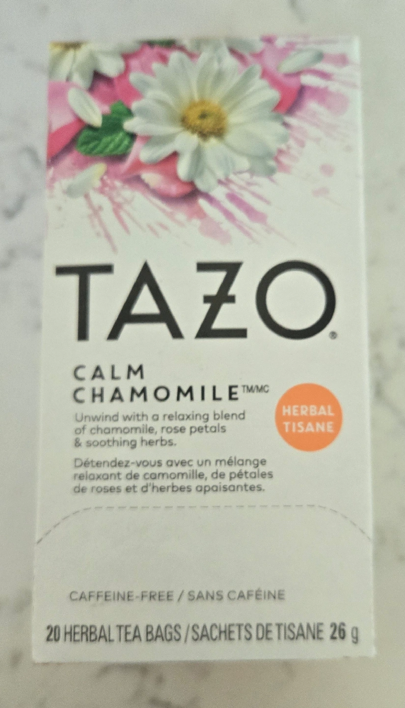 BRAND NEW NEVER OPENED Enjoy a relaxing cup of TAZO Calm Chamomile herbal tea! This caffeine-free blend includes chamomile, rose petals, and soothing herbs. Each box contains 20 herbal tea bags, perfect for unwinding after a long day
