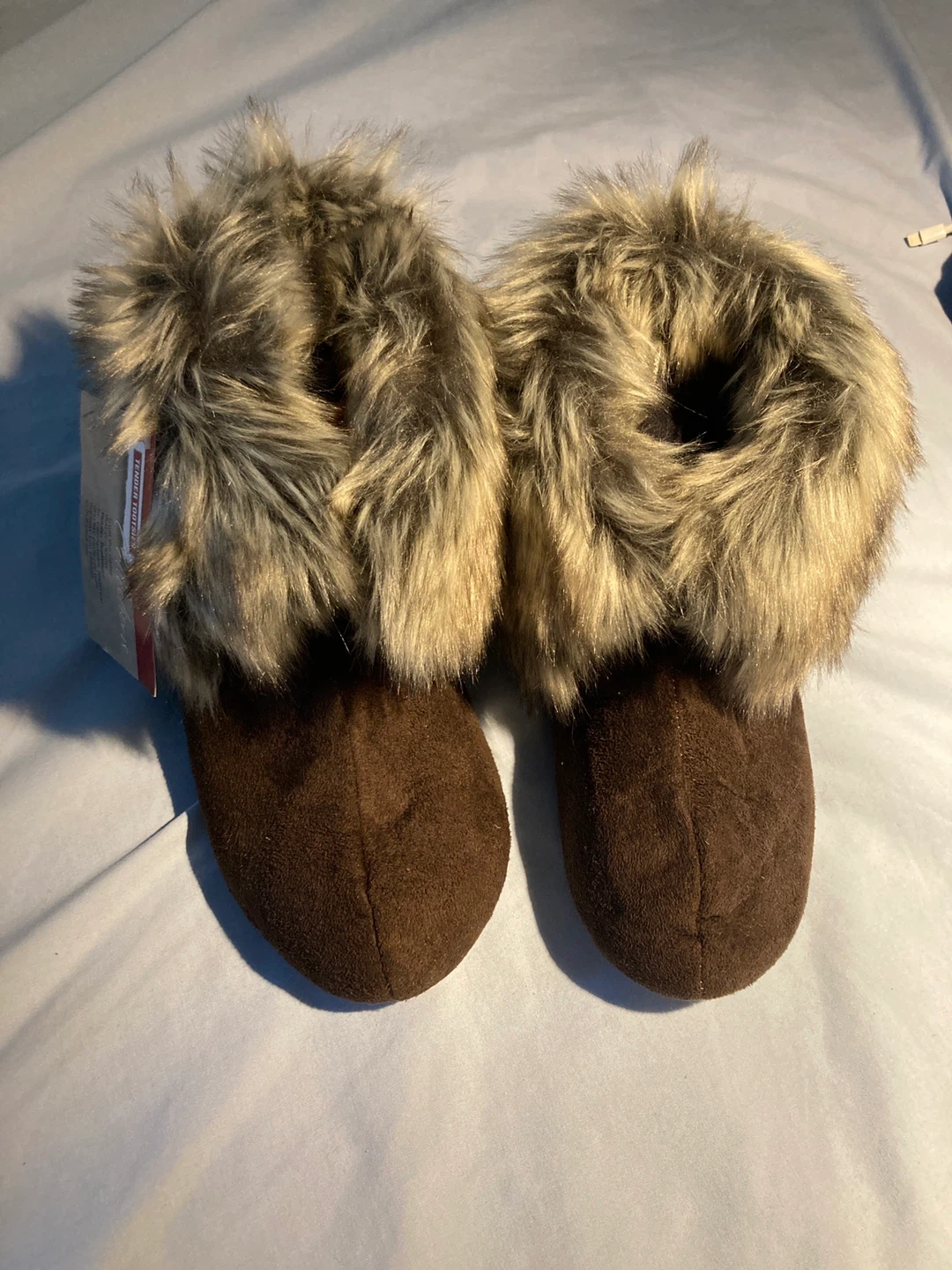 Brand new with tag still attached. Cozy up with these Tender Tootsies slippers! They're a size medium, fitting sizes 6 1/2 to 7 1/2. These slippers are washable and made in China. They feature a furry trim for extra warmth and comfort