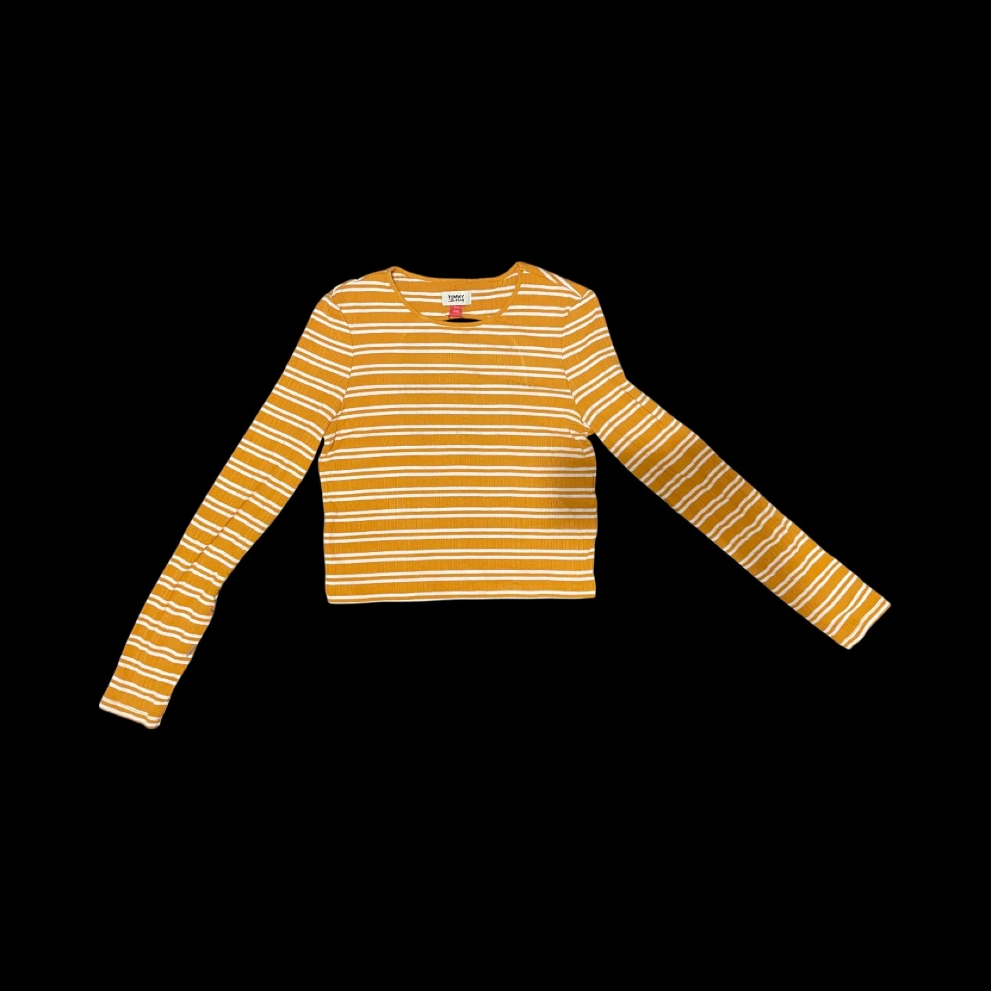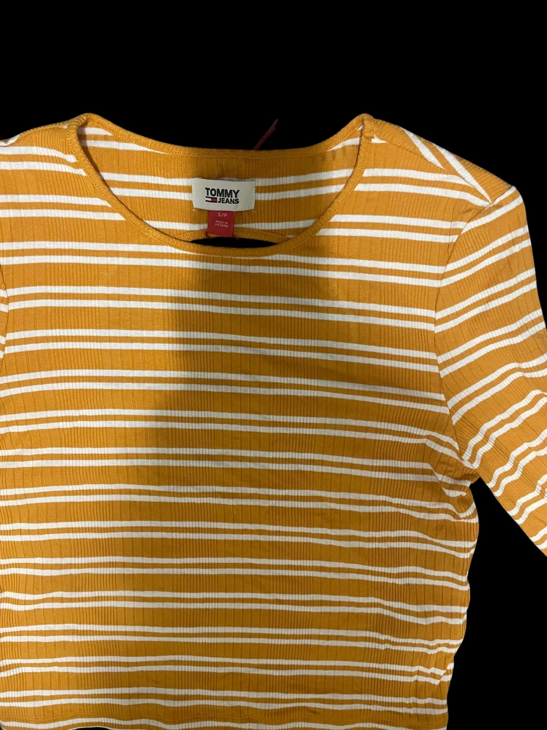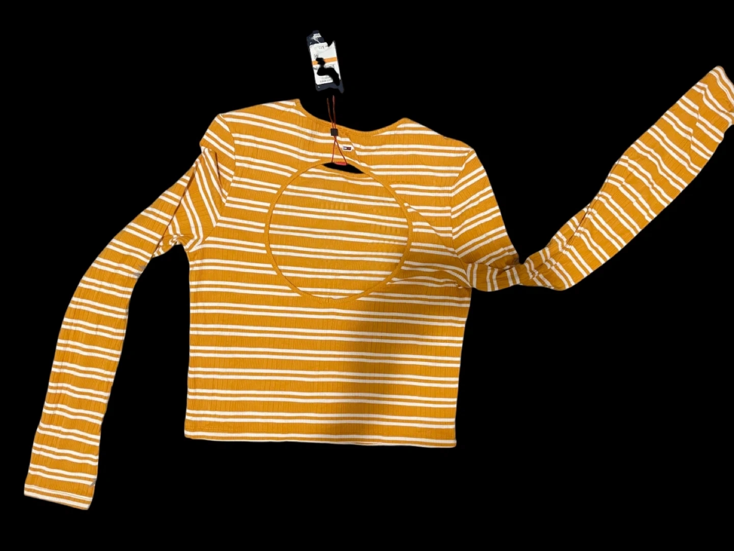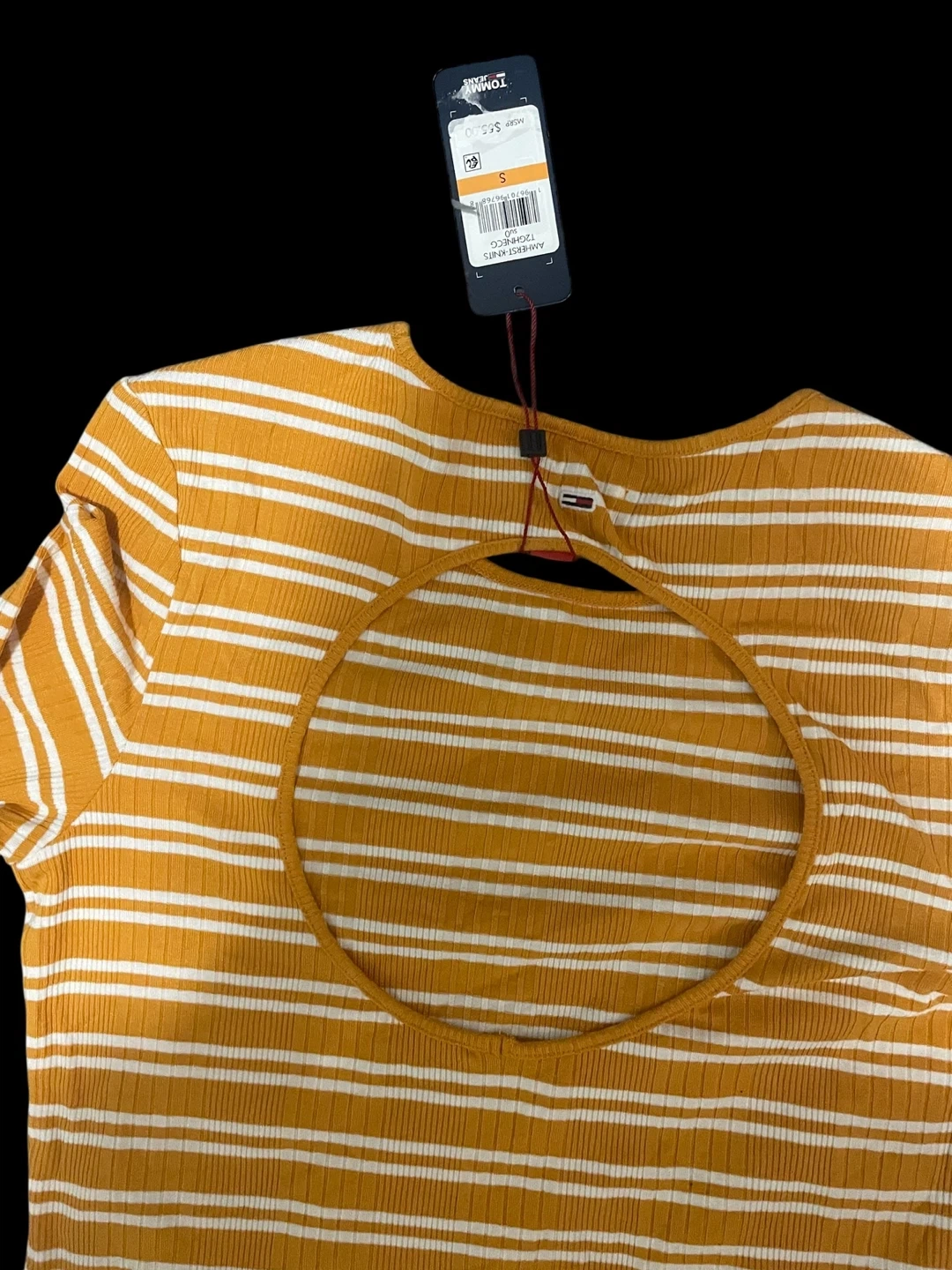 This is a brand new Tommy Jeans long sleeve top! It features a stylish striped pattern in a mustard yellow and white colour. The top has a unique cut-out design on the back. It's a size small.