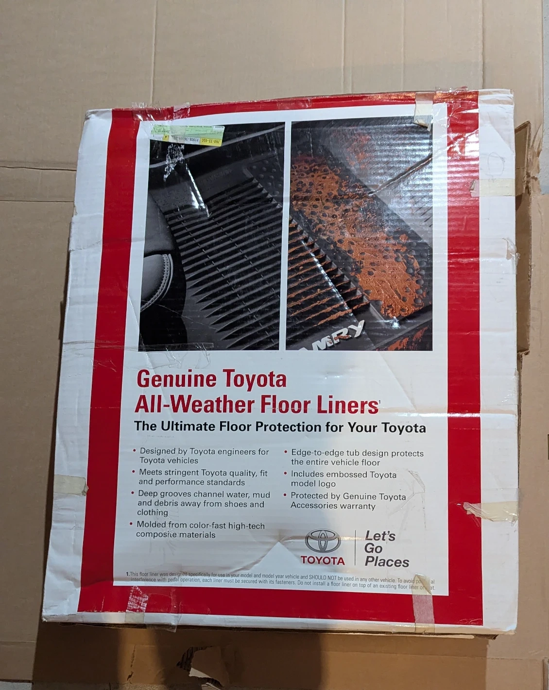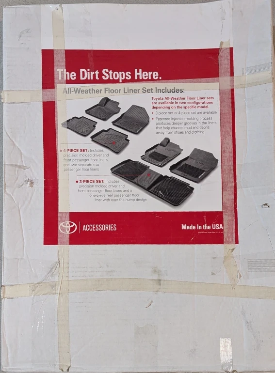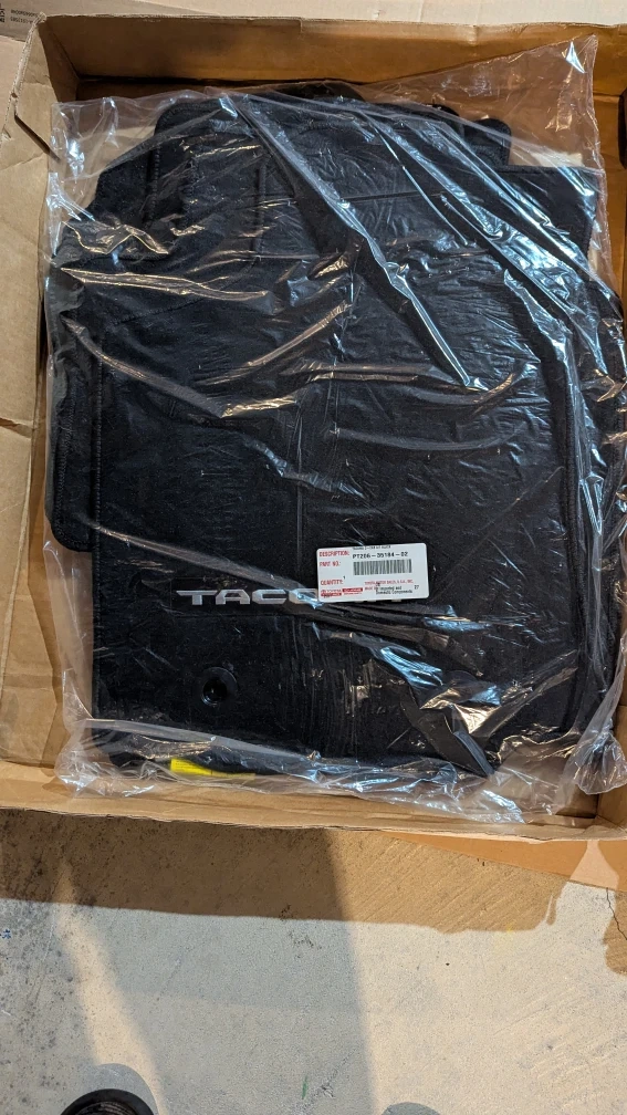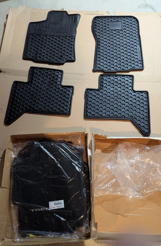 33Selling a set of brand new, genuine Toyota all-weather floor liners for a Tacoma! Designed by Toyota engineers specifically for Toyota vehicles, these liners ensure a perfect fit and excellent protection. They feature deep grooves to channel water, mud, and debris away from your shoes and clothing. Made from durable, color-fast composite materials, they’re built to last. The box and 4 carpet mats are included with the all-weather mats. Perfect for the rainy season—keep your truck clean and protected!