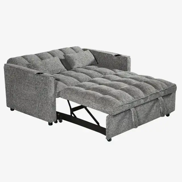 20we sell Pullout Bed, Sleeper couches, dining tables, kitchen tables, dinette sets, bedroom sets, single beds, futon, sofabed, sectional beds, sleeper couches, bunk beds, recliner sets, leather sofas, table lamps, pull out bed, sleeper sofa, twin bed mattresses, roll mattresses, memory foam mattresses, queen bed frame, metal bed frames, accent chairs, coffee tables, end tables, night tables, console table, sofa tables dining chairs, wooden tables, king bed frame kids bed children’s furniture, floor lamp, wall art, paintings, rugs, etc…… Aspire Fabric Upholstered Sofa Bed With Built-In USB Charging Ports - Grey Fabric Upholstery Built-in USB Ports and Cup Holders Ultra Comfortable Storage Pockets Accent Pillows Included Dimensions (W x H x D): Open: 56" x 30'' x 70'' (Approximately) Closed: 56" x 30'' x 33'' (Approximately) Cod Available Order From Our WEBSITE and Get It Delivered to Your Home www.cosmichomescanada.com **WhatsApp: 226-883-3111** $$DELIVERY AVAILABLE AT ADDITIONAL COST $$ ****CASH ON DELIVERY IS ALSO AVAILABLE PLEASE CONTACT***