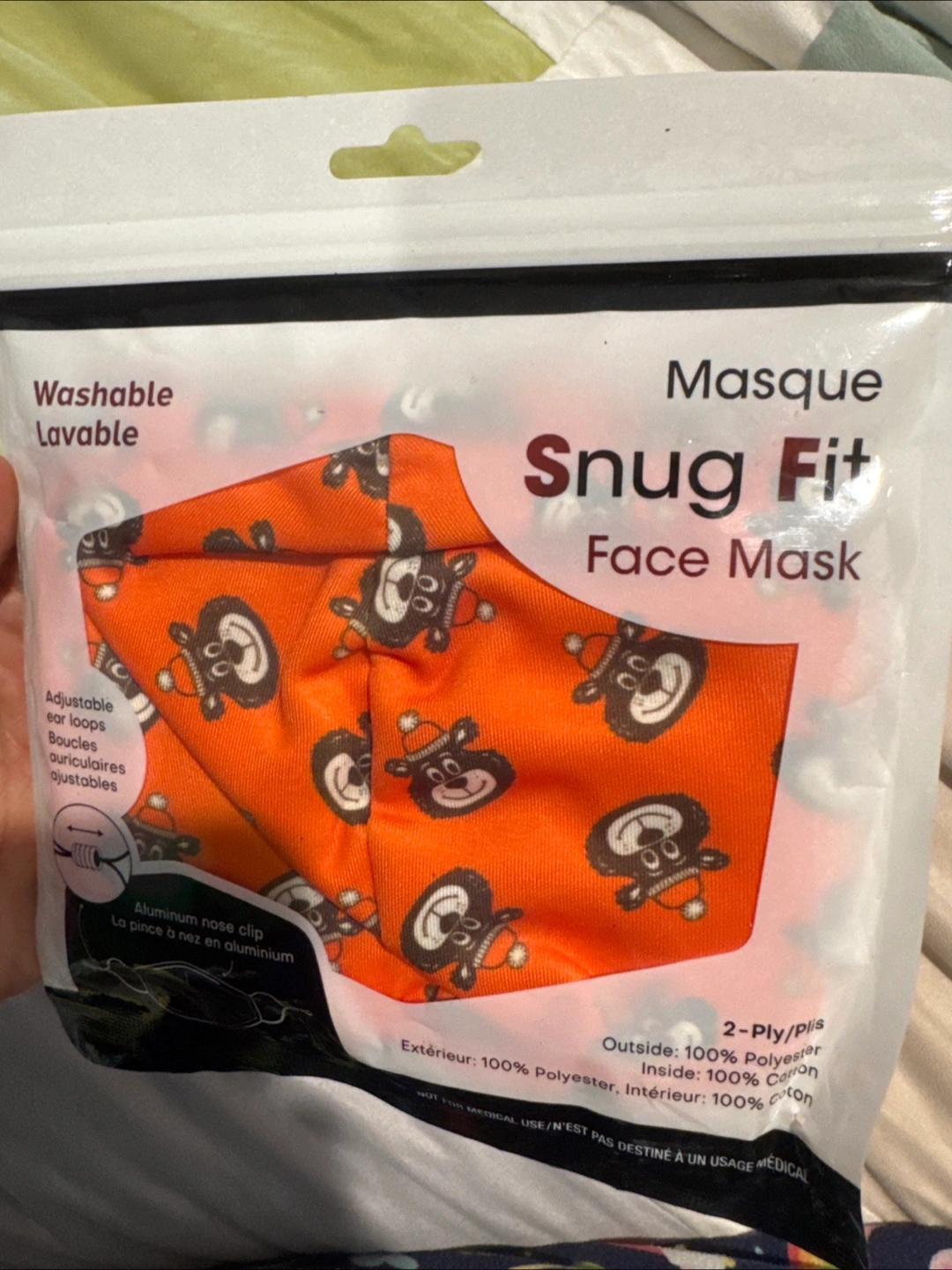 I have a brand new Snug Fit face mask. It's washable and has adjustable ear loops for a comfortable fit. It also features an aluminum nose clip. The mask is 2-ply, with the outside made of 100% polyester and the inside made of 100% cotton.