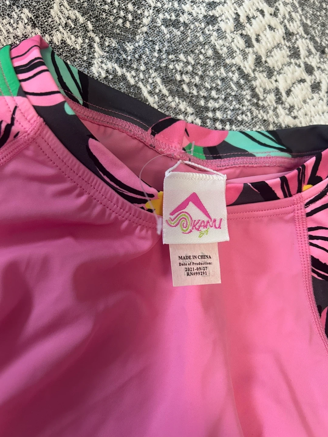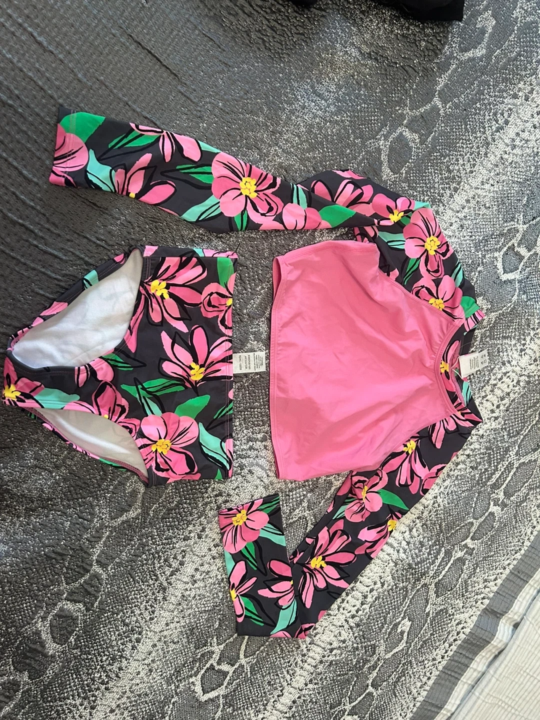 75A NEW cute Kanu Surf swimsuit set in size 8! The set includes a long-sleeved rash guard top and matching bottoms. Features a vibrant pink and floral design. Perfect for keeping your little one protected from the sun while swimming size 14/16