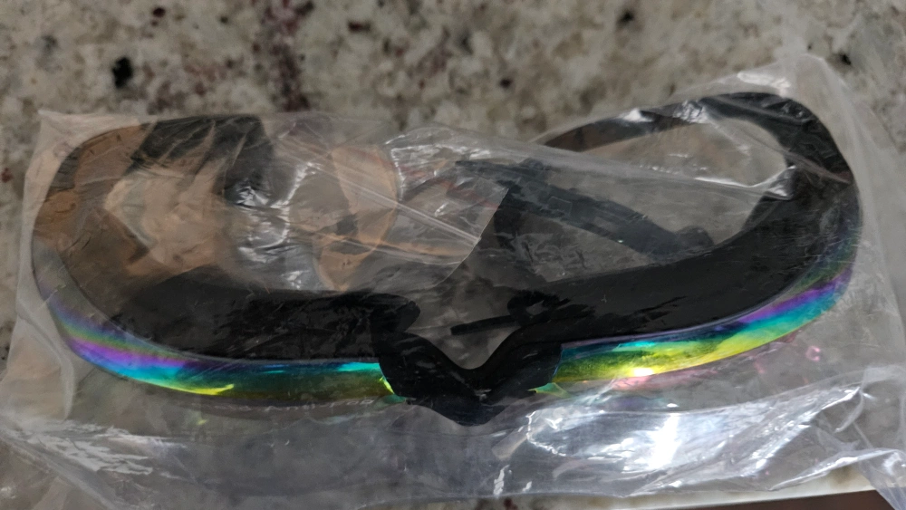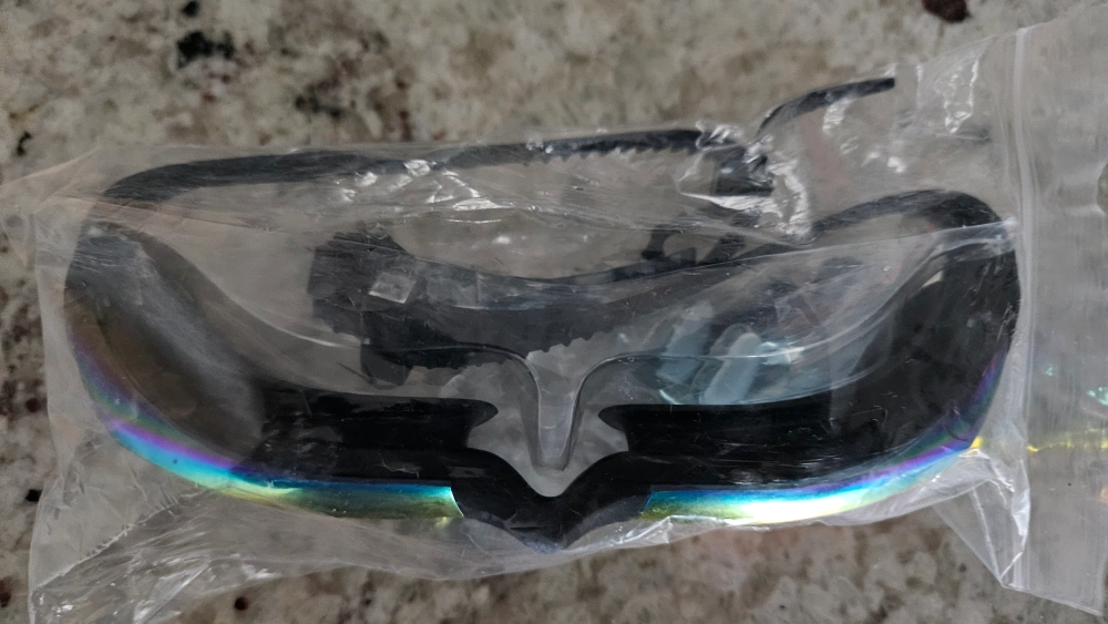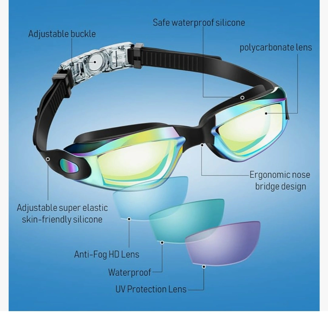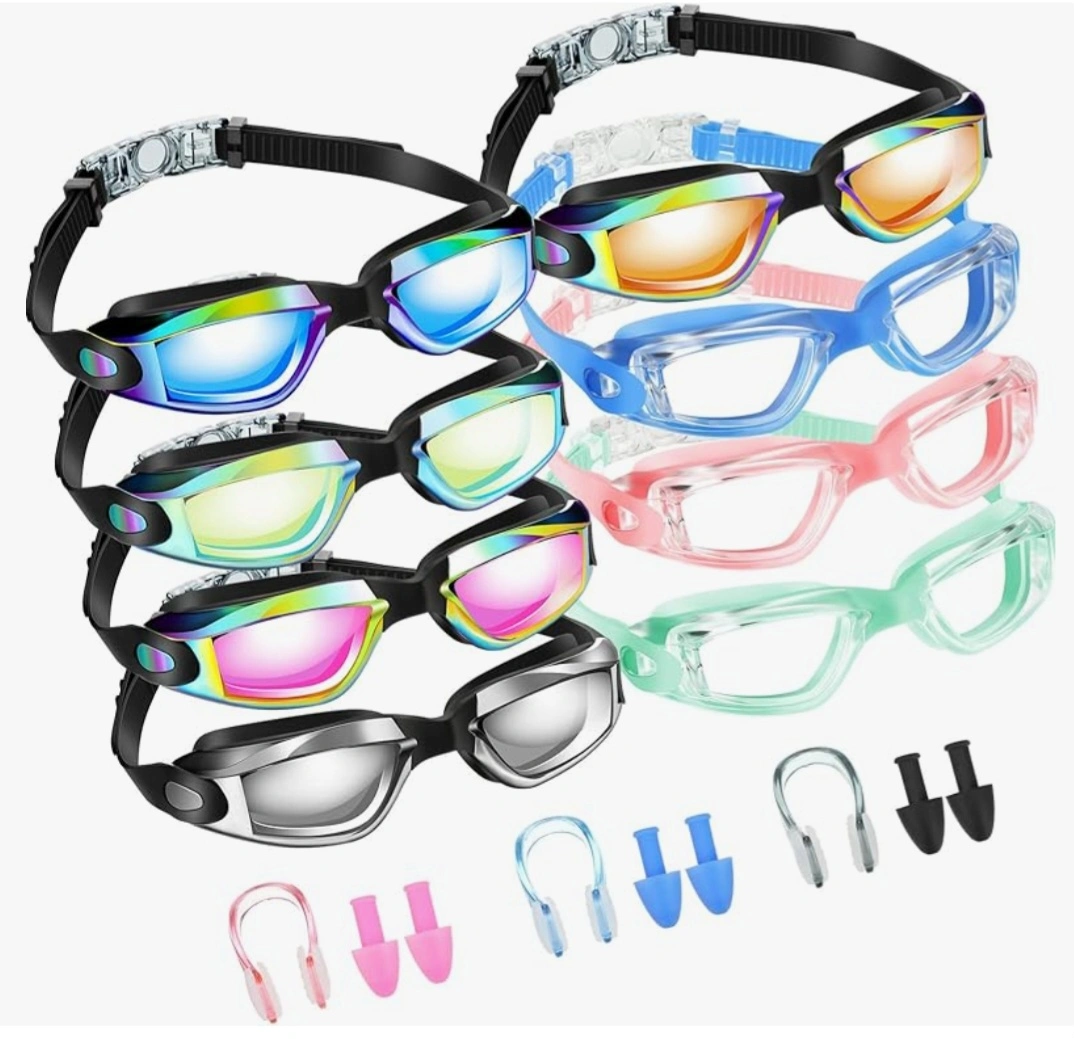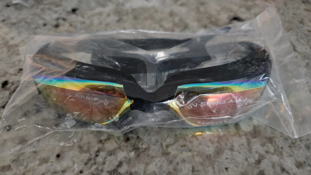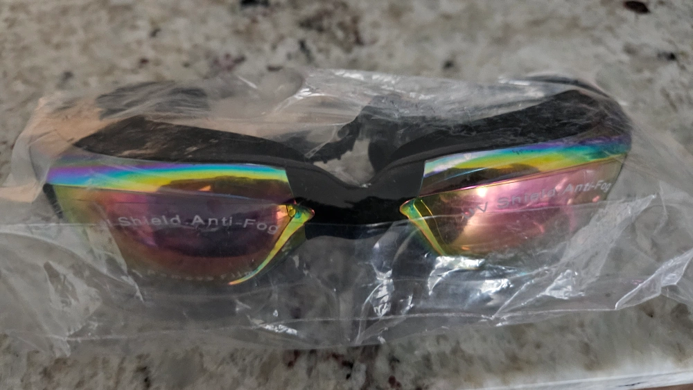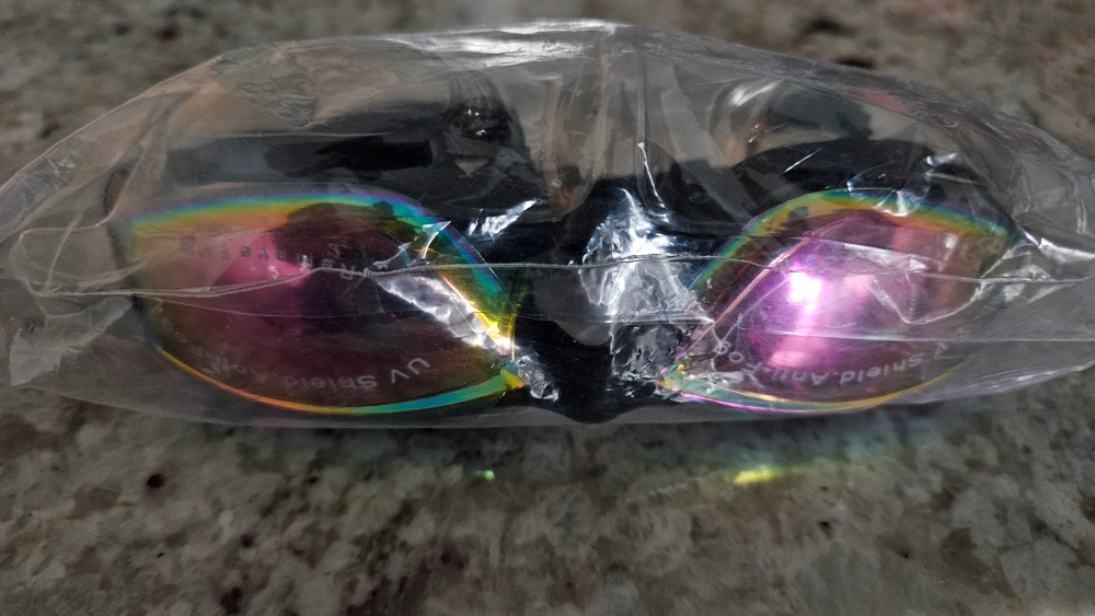 123Brand new swimming goggles. Features a rainbow-coloured finish and polarized/mirrored lens. UV protection and anti-fog lenses. Includes nose clip and ear plugs, and an adjustable strap. New in package. Can either purchase one for $10, or more than one for $8 each (I have 7 in total - see last picture). Great for swimming in the pool or beach. Fits adults and kids.