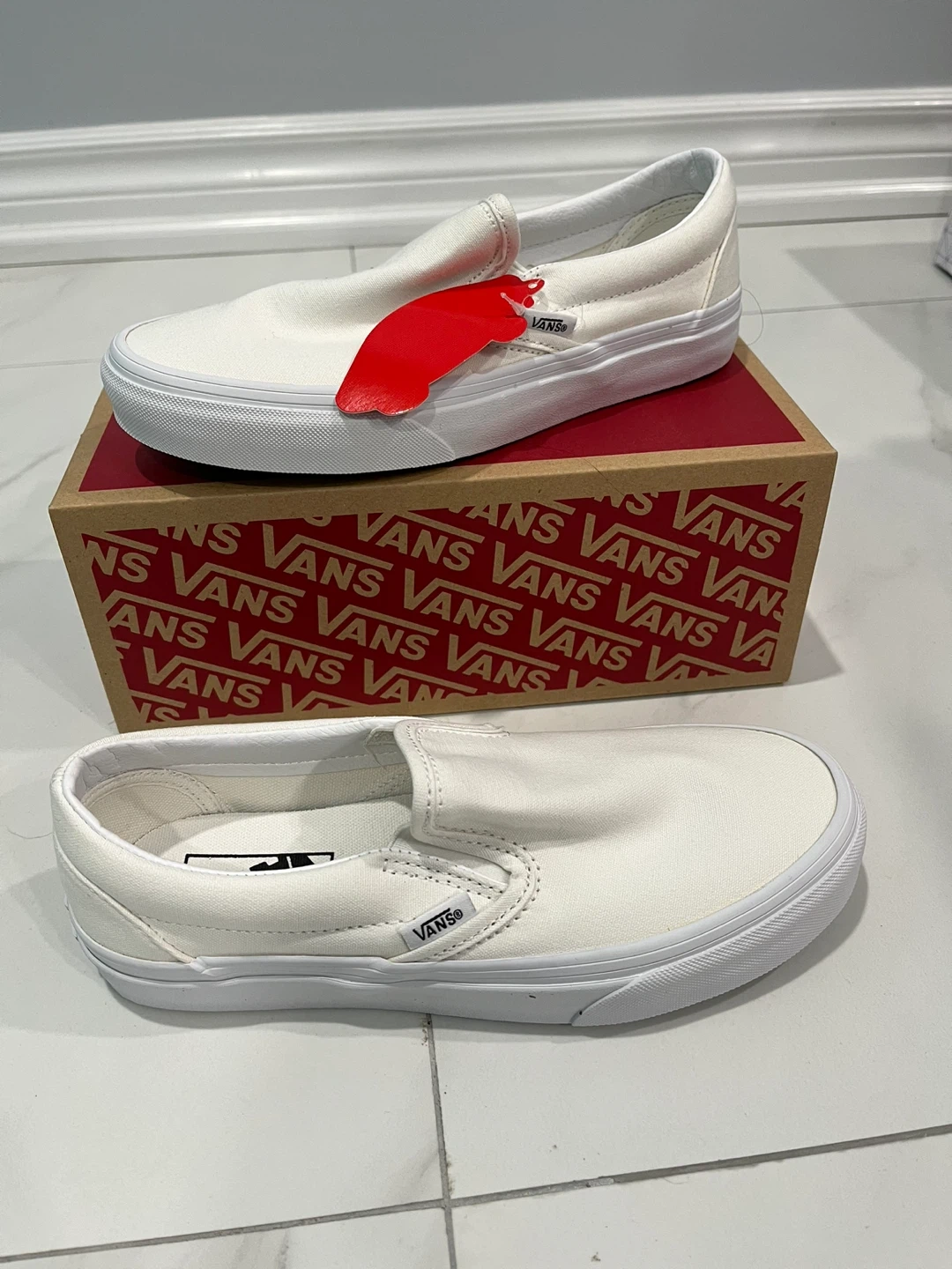 10Selling a pair of brand new Vans Classic Slip-On shoes in white! They come with the original box. A classic, comfortable, and stylish choice for everyday wear