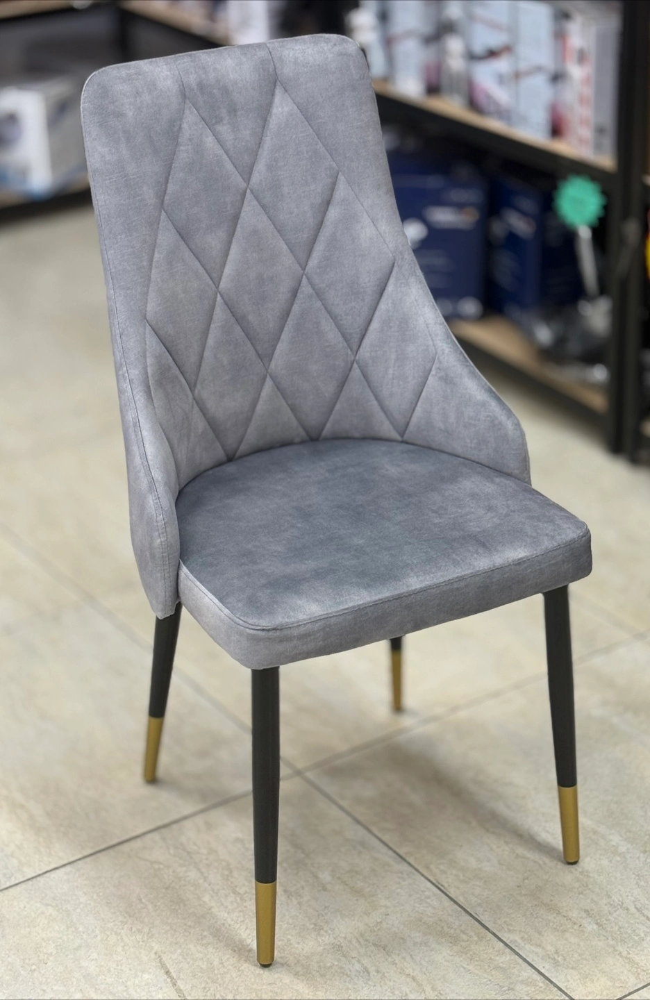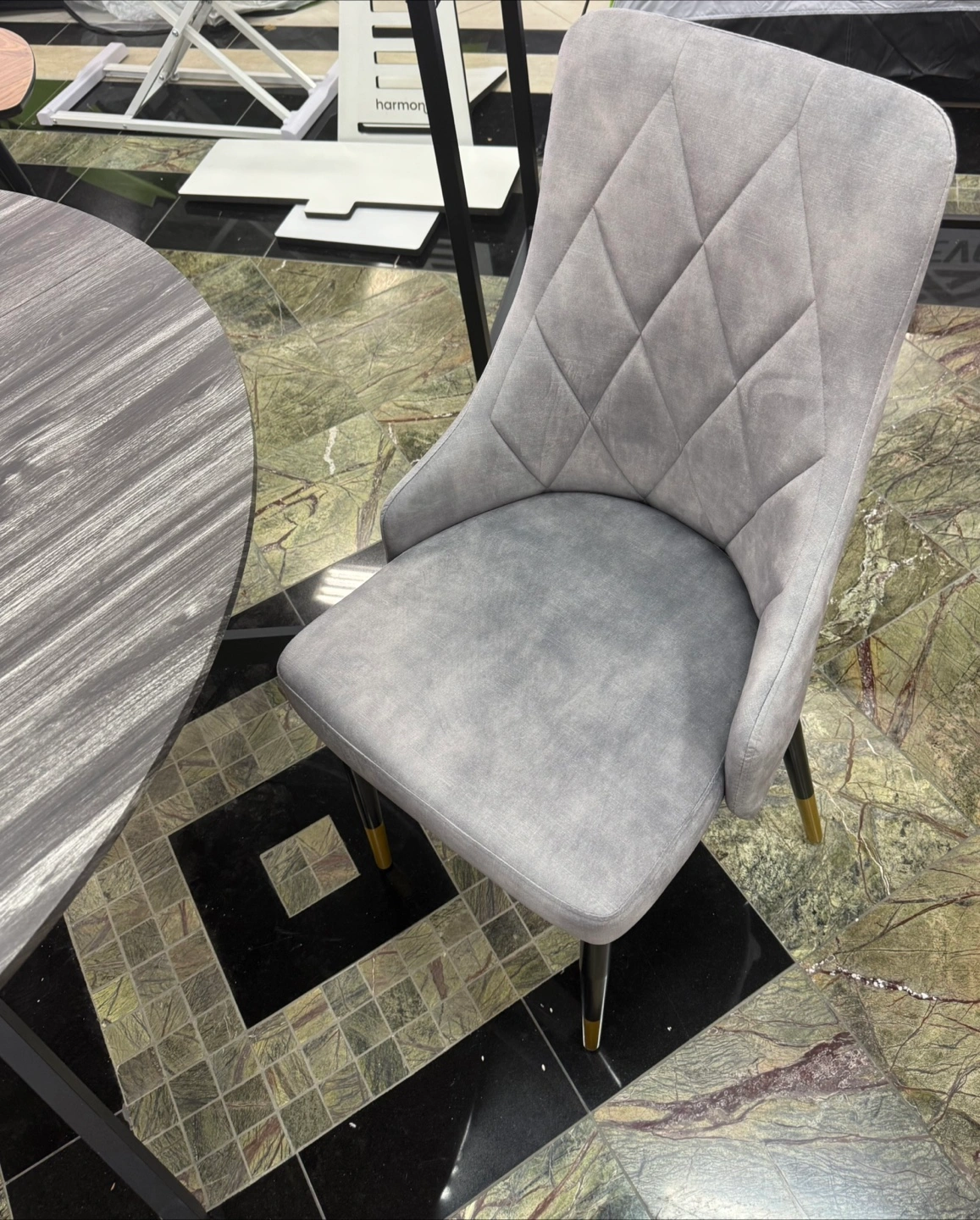 Brand New never been used. Selling a lovely Harmoni dining chairs in a stylish grey colour. It features a quilted design on the backrest and sleek black legs with gold accents at the bottom. This chairs would be a great addition to any dining room or kitchen!