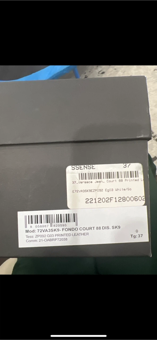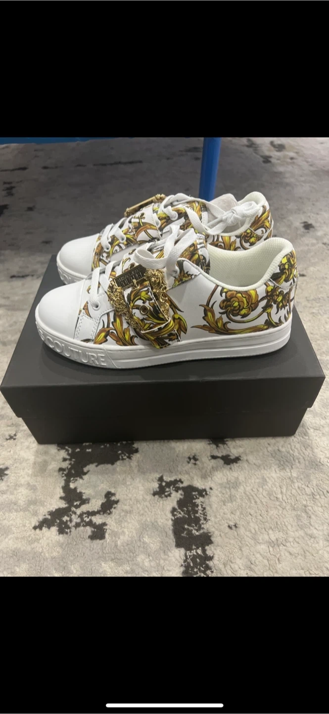 18Selling a pair of Versace Jeans Couture Fondo Court 88 sneakers in white and gold! These stylish sneakers are in excellent condition and come with the original box. They are a size 37. The shoes feature a unique printed leather design. Perfect for adding a touch of luxury to your everyday look