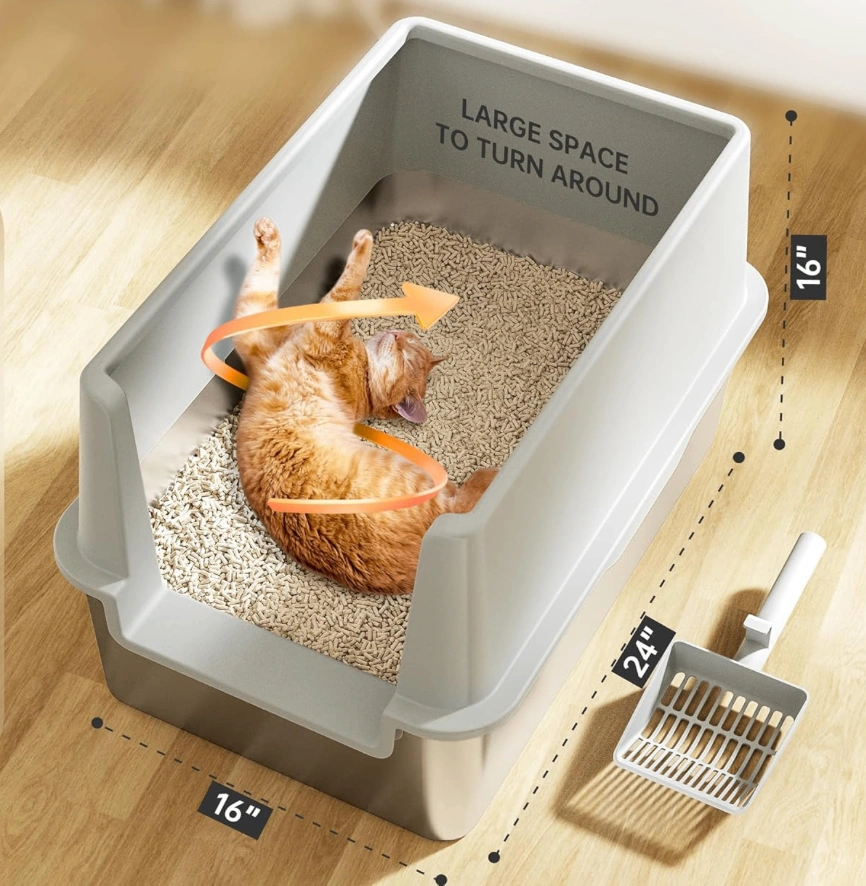 129The height is 16"- so this litter box has extra high sides. Measurements in photos.