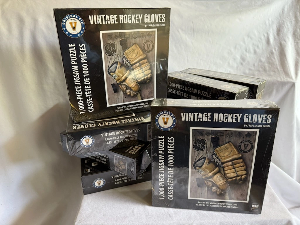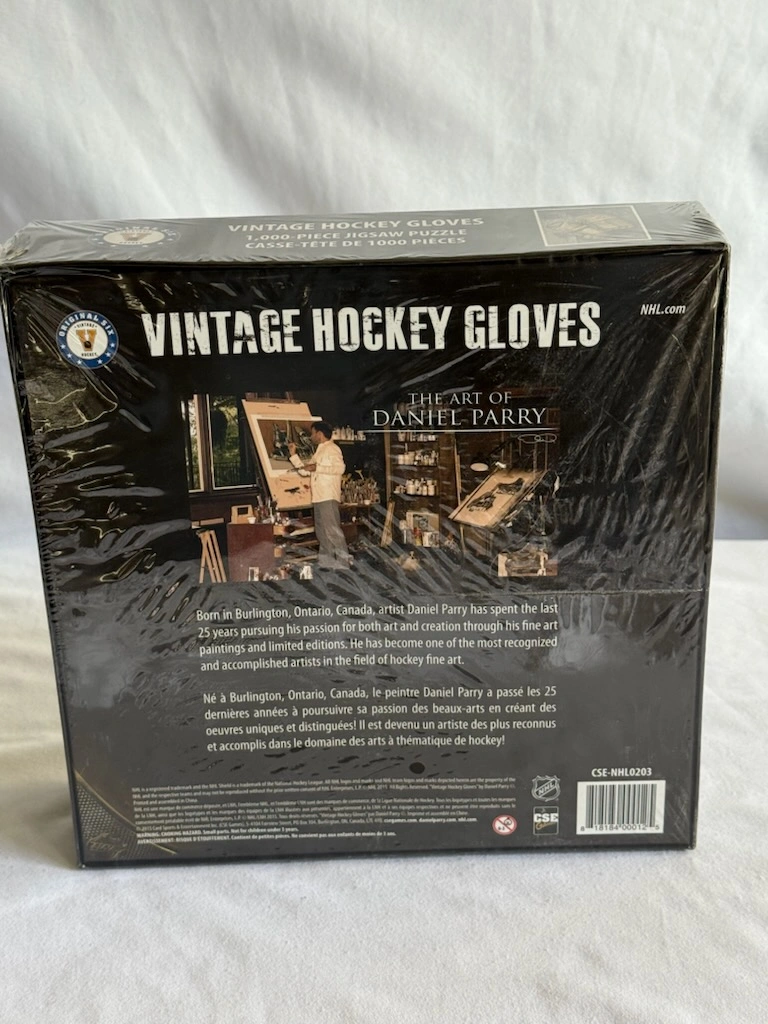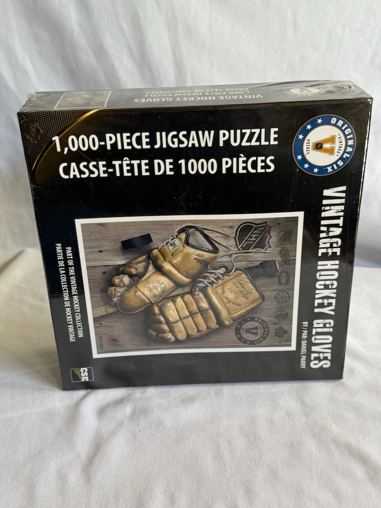 I have a brand new, sealed 1000-piece jigsaw puzzle for sale! It's the Vintage Hockey Gloves edition, part of the Vintage Hockey Collection. The puzzle features artwork by Daniel Parry. Perfect for hockey fans and puzzle enthusiasts!