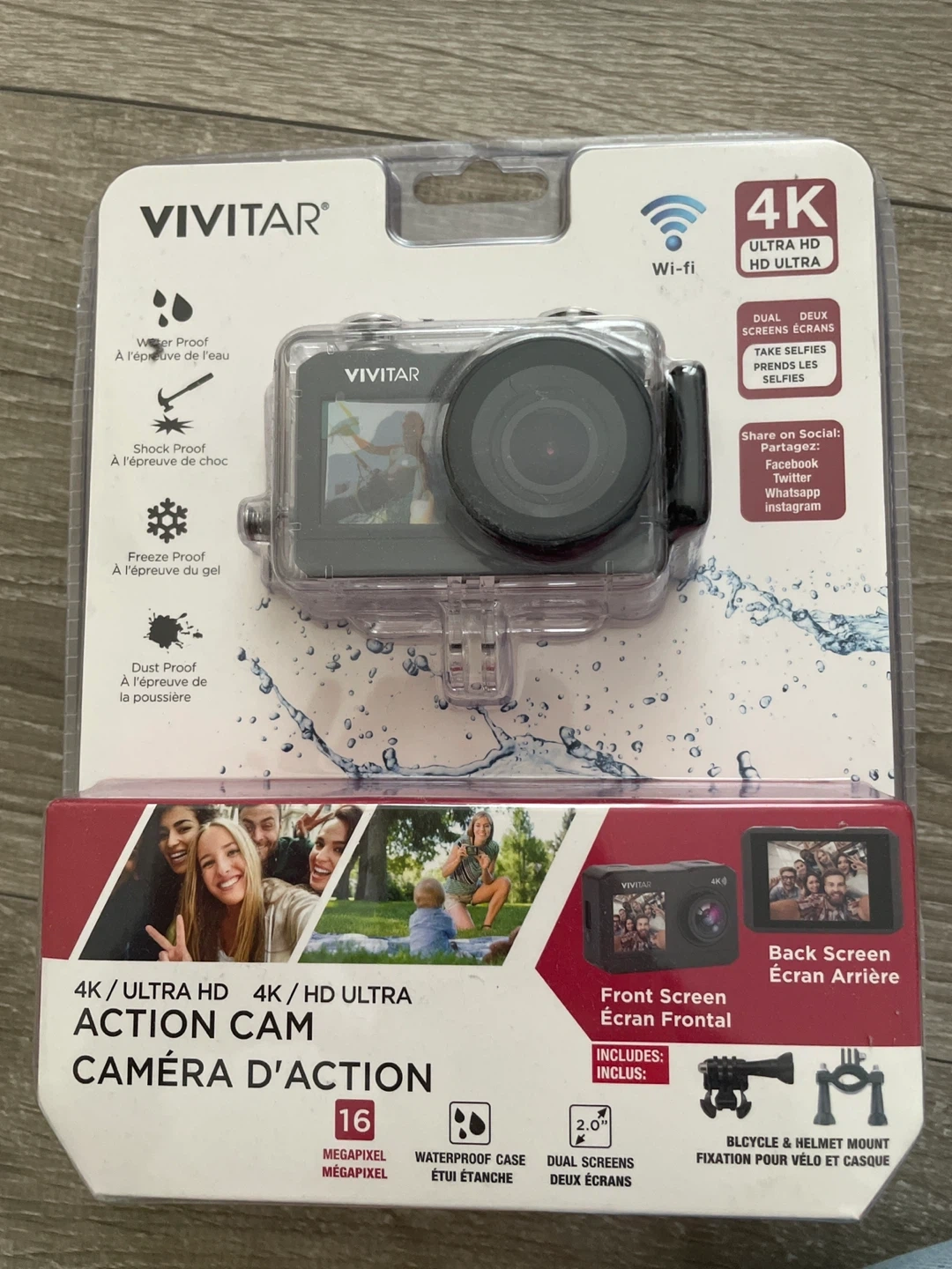 Selling a brand new Vivitar 4K Ultra HD Action Cam! It's waterproof and can take selfies. It also comes with a bicycle and helmet mount, so you can record all your adventures. It has dual screens and is dust proof too