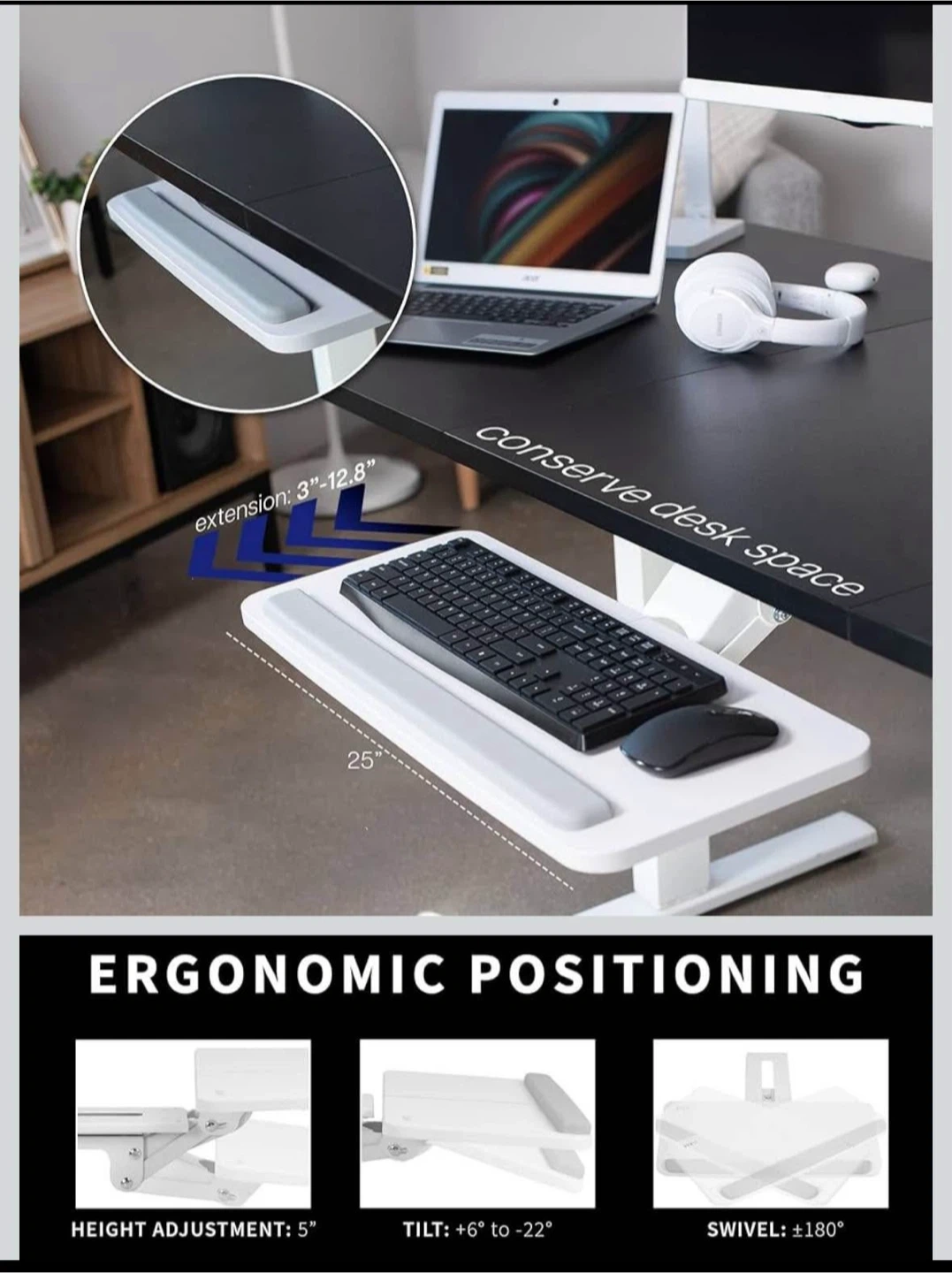 18Looking to free up some desk space? This VIVO under-desk keyboard tray is the perfect solution! It extends from 3" to 12.8" and swivels ±180°, letting you find the perfect ergonomic position. It also offers height adjustment of 5" and a tilt range of +6° to -22° (25 x 10 inch)