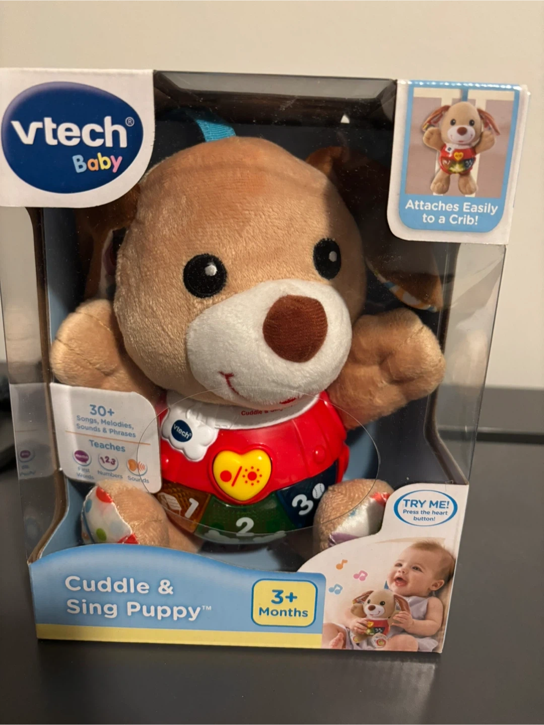 I'm selling a brand new VTech Baby Cuddle & Sing Puppy! This interactive toy is suitable for babies 3+ months and teaches first words, numbers, and sounds. It also plays 30+ songs, melodies, sounds, and phrases. It's designed to attach easily to a crib, and the heart button can be pressed to activate sounds and music