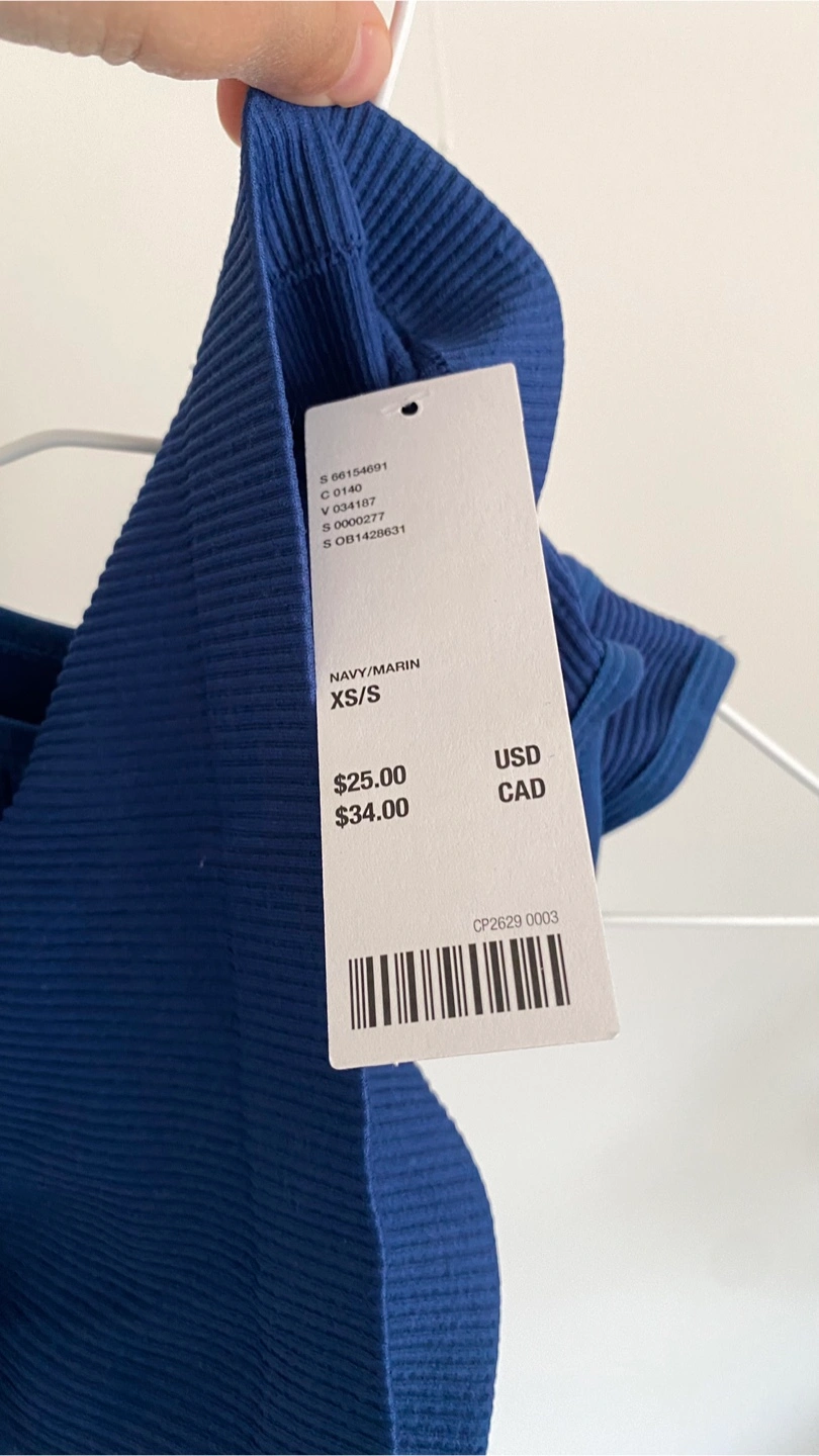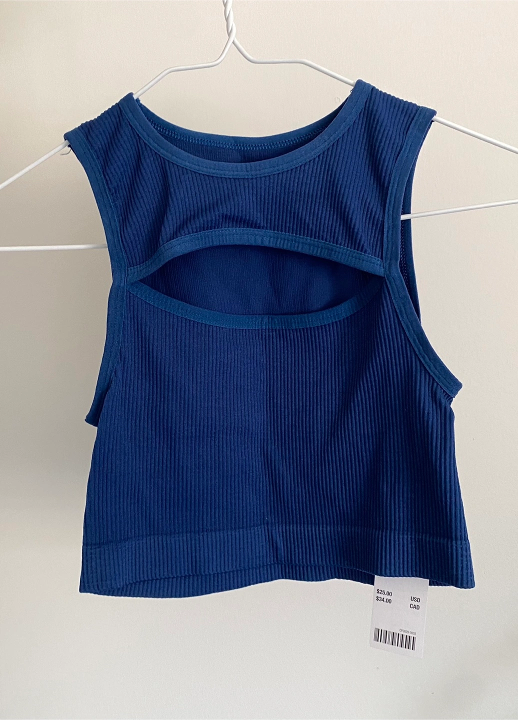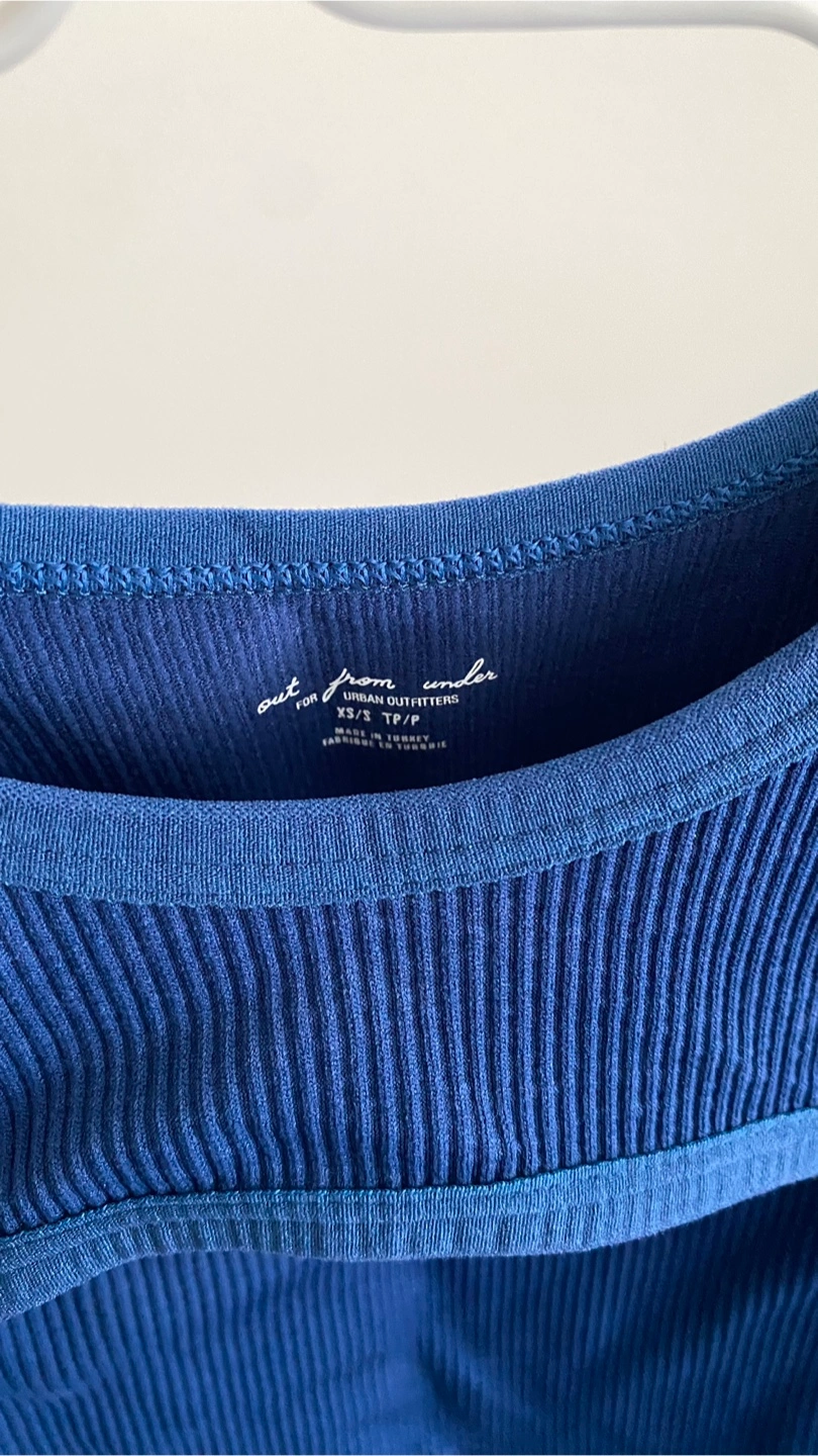 Brand new with tag Blue tank top. Ribbed material. Features a cutout.