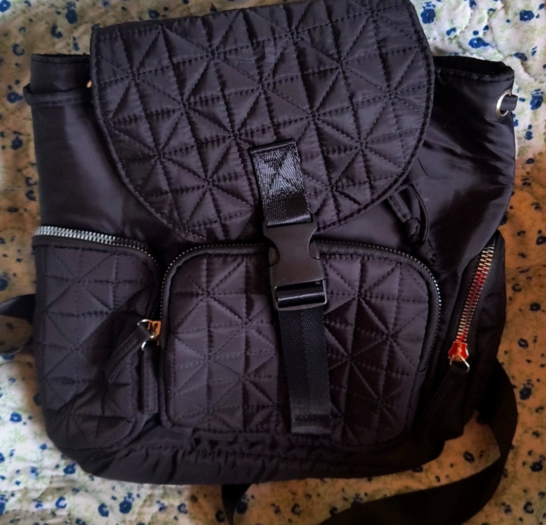 438Black quilted backpack with a large main compartment and front pocket. Adjustable straps and a buckle closure.