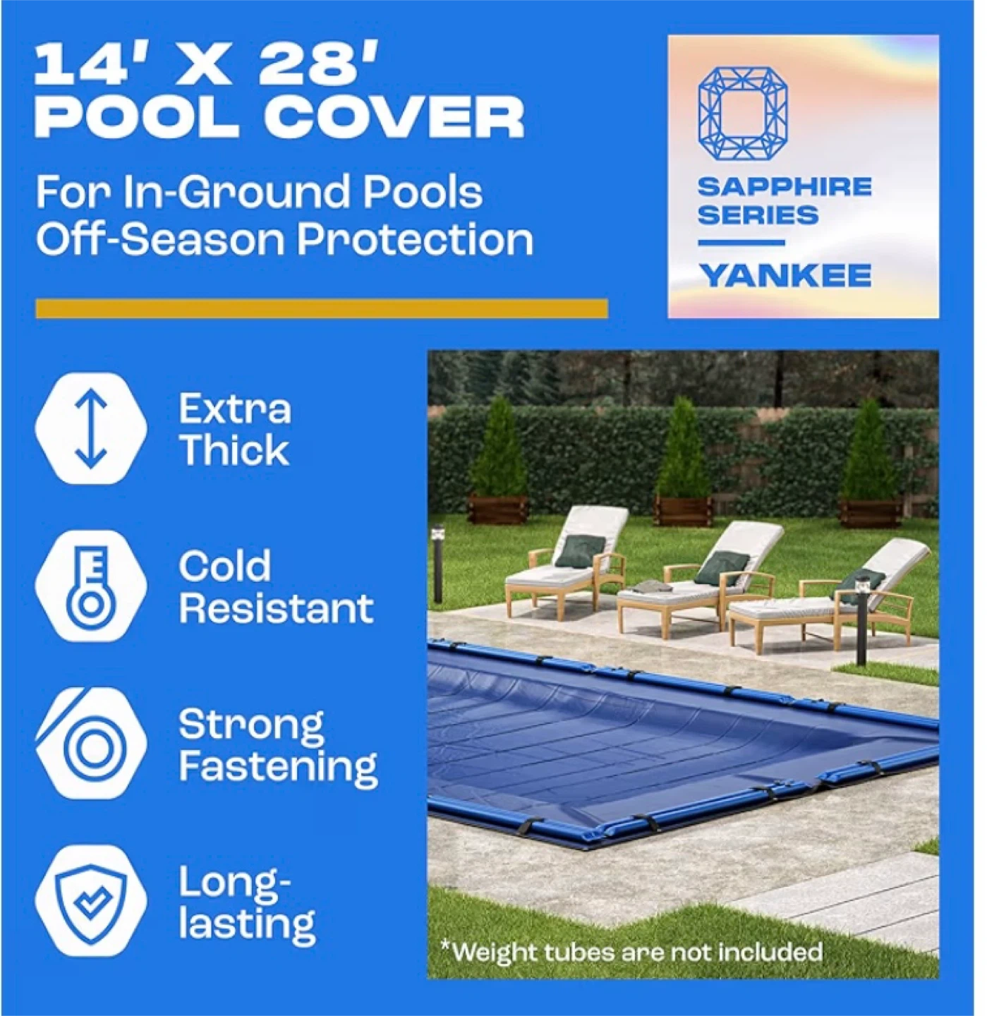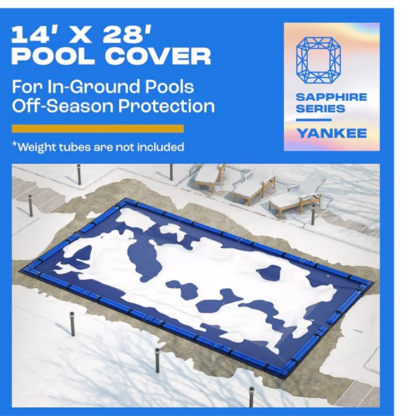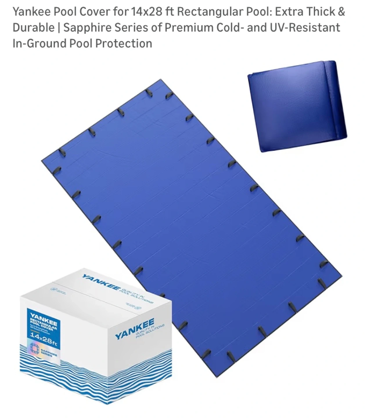 New Yankee Pool Cover for 14x28 ft Rectangular In-ground Pool Extra Thick & Durable | Sapphire Series of Premium Cold- and UV-Resistant In-Ground Pool Protection $125 (retail $170 plus tax) Pickup in Whitby This winter pool cover boasts a 14×14 scrim count (the industry’s top standard) and a density of 185 gsm with the pool cover for reliable seams. PROTECTION FROM SUNLIGHT AND OVERGROWING. Inground pool covers must protect the pool from UV radiation that stays high in winter. Our pool closing kit has LDPE coating on it that’s been tested to withstand solar ultraviolet. The BLACK UNDERSIDE of the pool blanket won’t let the water overgrow. HIGHLY RESISTANT TO COLD. You want your pool cover (inground) to survive low temperatures. Unlike a simpler pool tarp, this swimming pool cover will cope with the cold as bad as −10° F (−25° C) and the heat as high as 180° F (80° C).