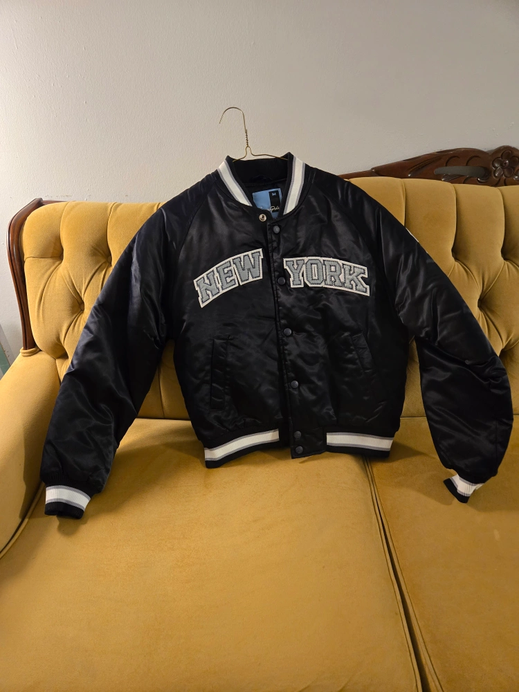 Here's a stylish New York satin bomber jacket! It's black with white accents on the collar, cuffs, and hem. Perfect for adding a cool, casual touch to your outfit
